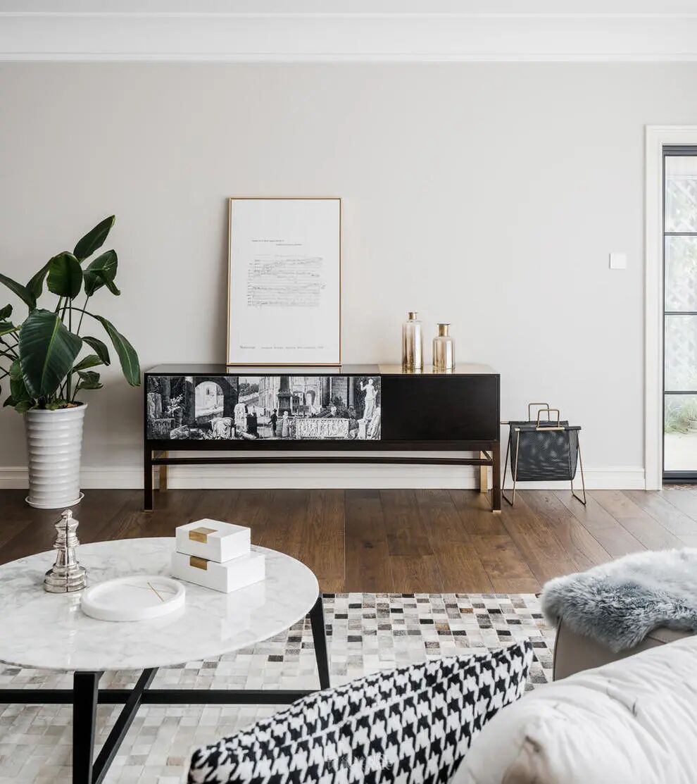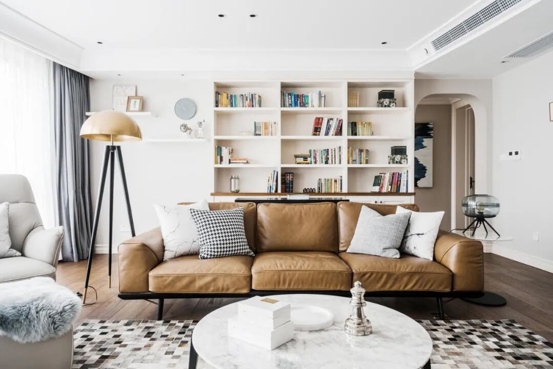 中间棕色沙发搭配摩登复古的落地灯,似乎是走进了一个书香四溢的学习空间,又不乏舒适感。以金属条勾勒的电视柜,结构简约硬朗,同时也呼应着玄关处的边桌,中和了黑白色调,点缀着跳跃,表面的艺术插画形式感十足,对应对面的书墙,俨然将阅读与艺术的家庭氛围烘托到极致。