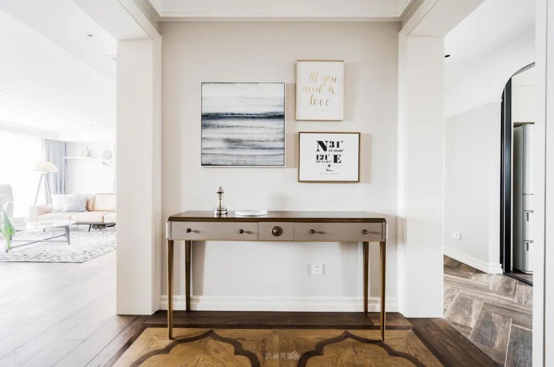 那张摩登复古的桌子正对入户门,可以作为随手物品的摆放区域,同时也增加了入户格调,仿佛将复古的英伦风情也引入室内,渲染着氛围。