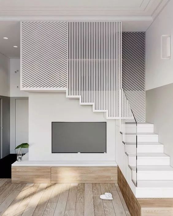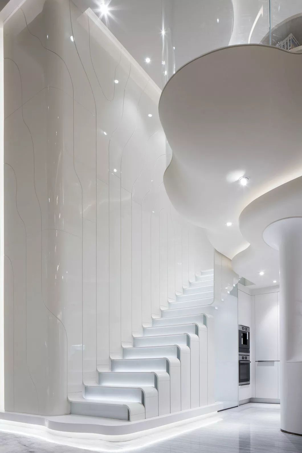 同样从安全性方面考虑,楼梯一般都会有扶手,即使不用,也让人在心理上感觉有支撑点,进而感觉更加安全。现在也很流行一体式的楼梯,将台阶和扶手以圆弧形进行自然过度,将两者合二为一,线条非常流畅,视觉上也更加柔和、美观,即使是纯白色的,也让空间显得很有人情味~