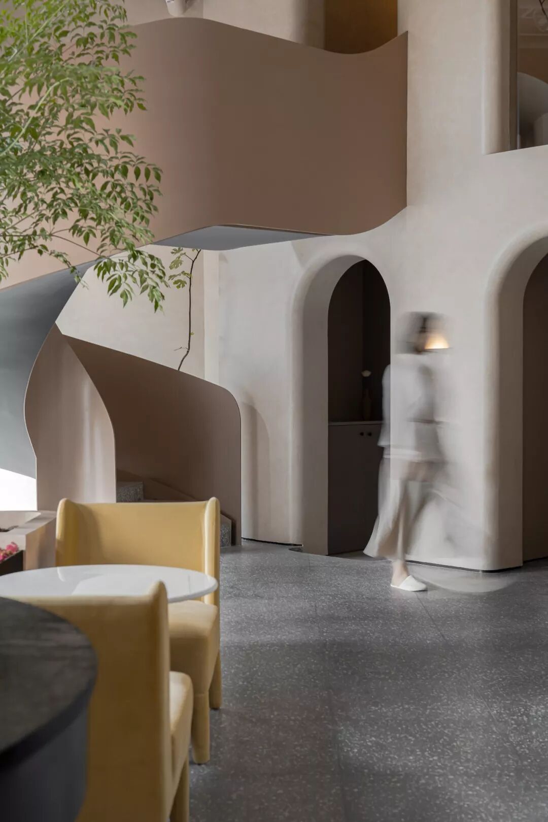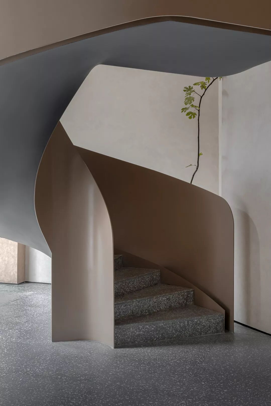 大多数的楼梯,一面是墙,另一面则是扶手。但实际上也可以将扶手的那一面也做成墙面。在一些商业的网红店中,其实是非常常见的,在两面的墙上可以有相关的文化或者产品的简介与展示。