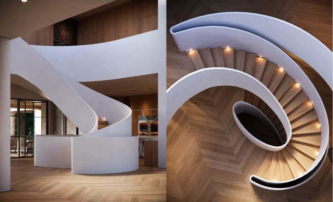 这种方式在现在其实已经非常流行了,原木色或者石纹的台阶,搭配一体式的曲线扶手,视觉上感觉非常流畅自然,犹如一条优美的丝带,给空间带来艺术的美感,同时让空间多了些柔美温和的感觉,在旁边喝个下午茶、吃点甜品,心不免也变得柔软起来。