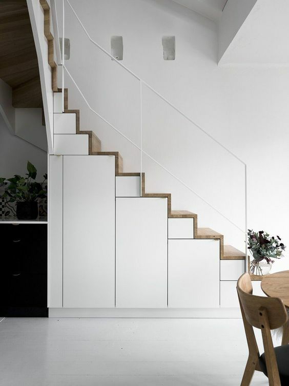 楼梯的阶梯大多是统一高度、统一材质、统一造型的,虽然在安全性上更有保障,但是未免有些单调。现在很流行一种方法,是将楼梯的阶梯用立方体收纳柜来实现,也可以在一层作为书柜来使用。