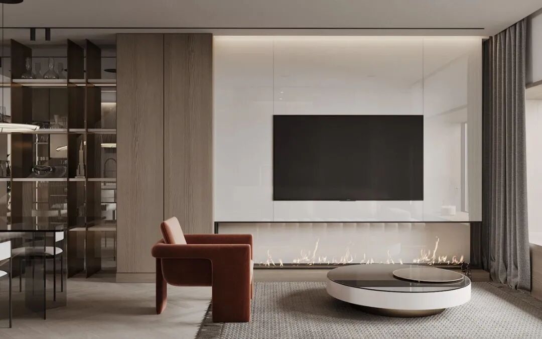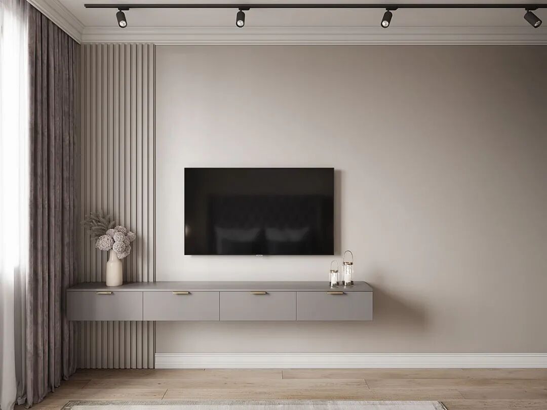 入墙式设计:传统的电视+收纳柜的组合的开放式格子容易积灰,不如将电视换成投影,收纳柜则藏于墙体,遵循藏八露二原则,将电器、电线藏起来,减少积灰可能。