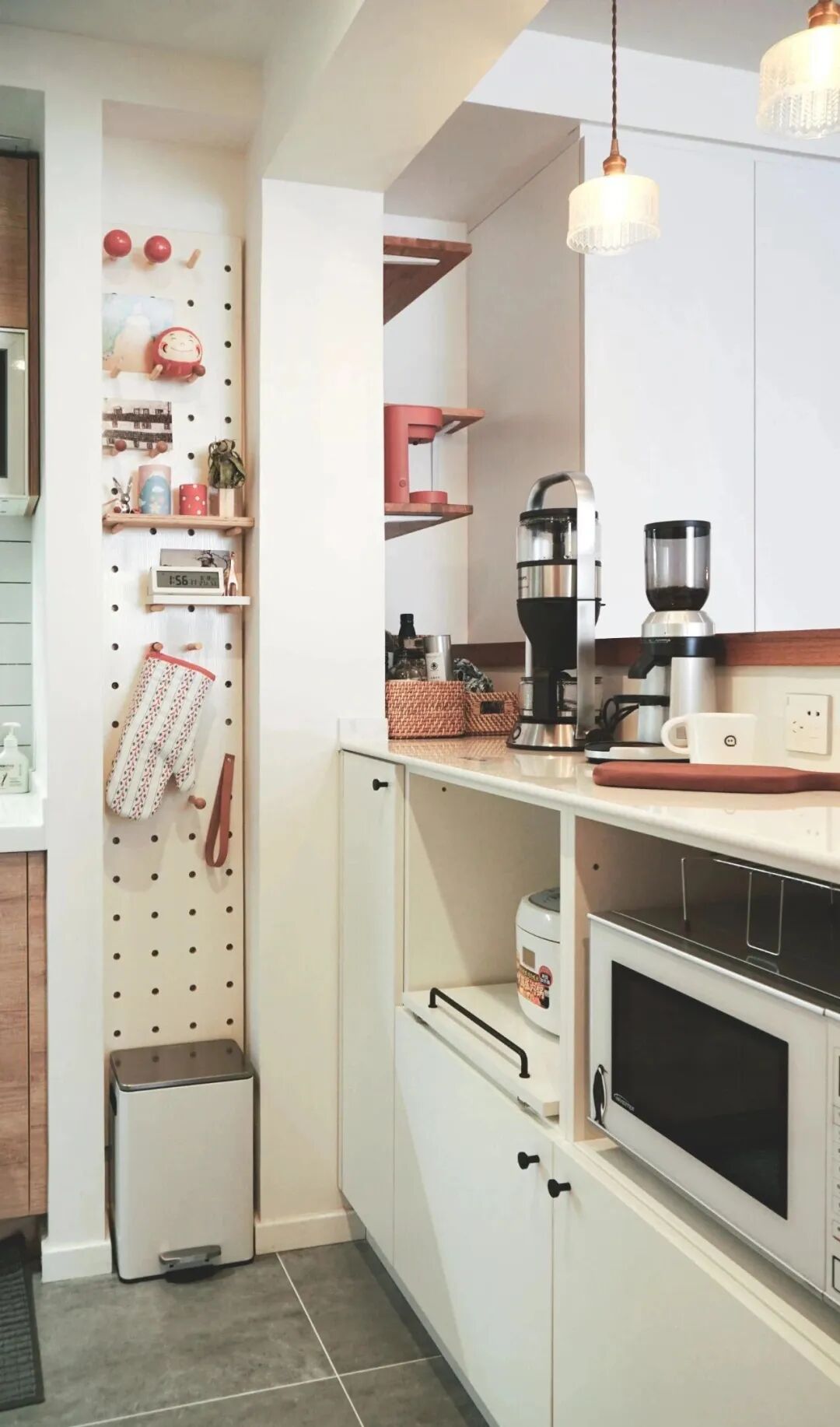 减少杂物堆积:厨具等堆在台面上太乱又容易积灰沾油,放在柜子里又不方便拿取,不如利用墙面或墙体之间的凹槽,洞洞板搭配挂钩、搁板,实用、有趣又美观,十分适合小户型。