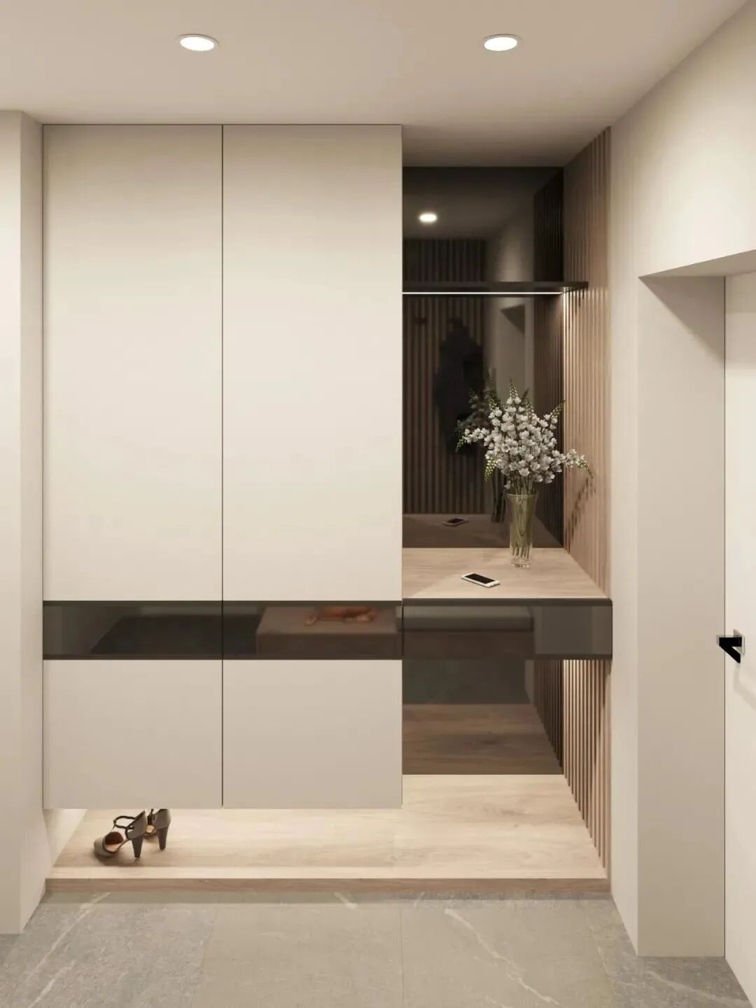 悬浮玄关柜:与地面预留15-20cm空隙,方便放置常穿鞋,避免将鞋底的泥土、污垢带入室内,不落地的设计还省得弯腰拿取,解放了双手。