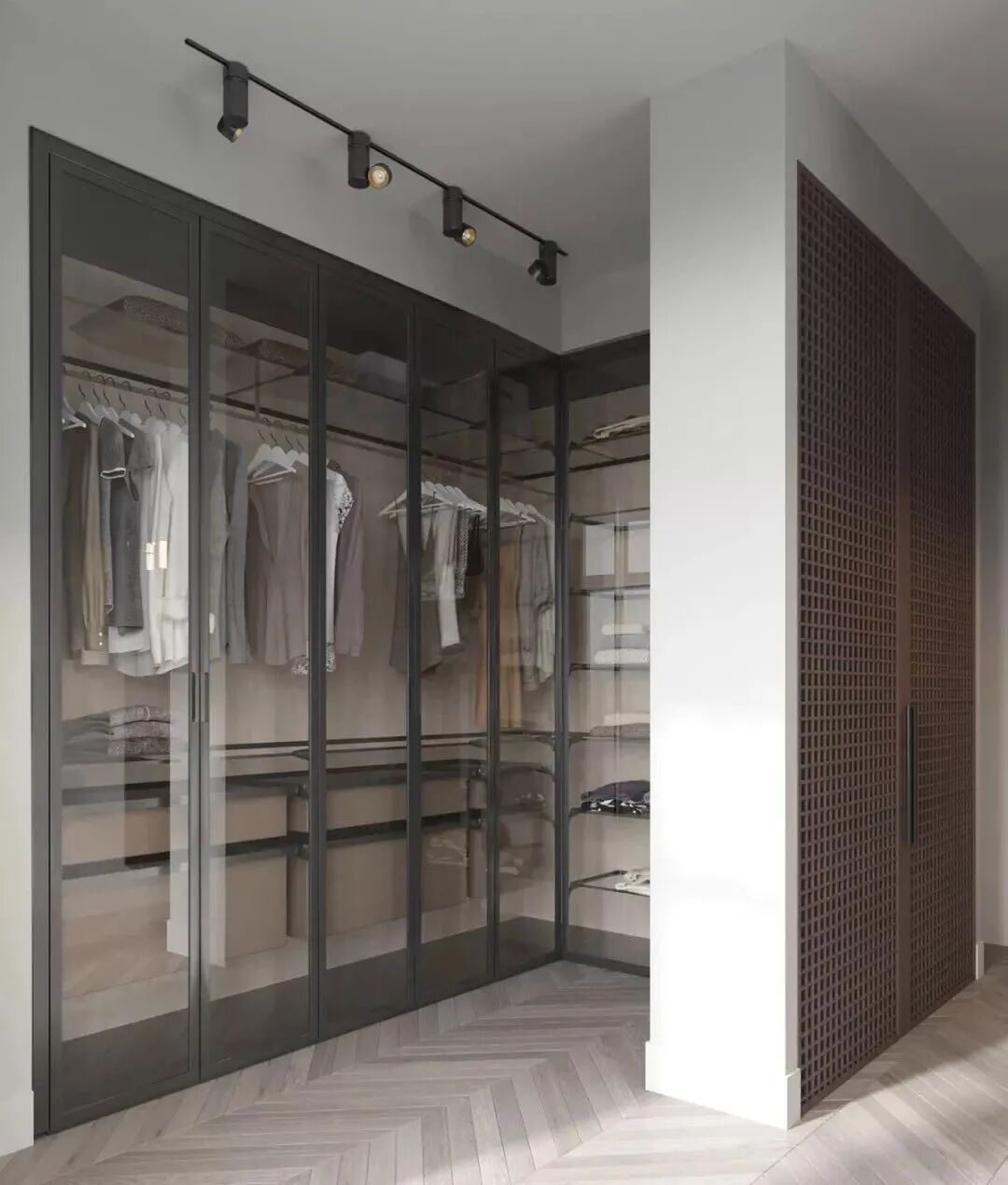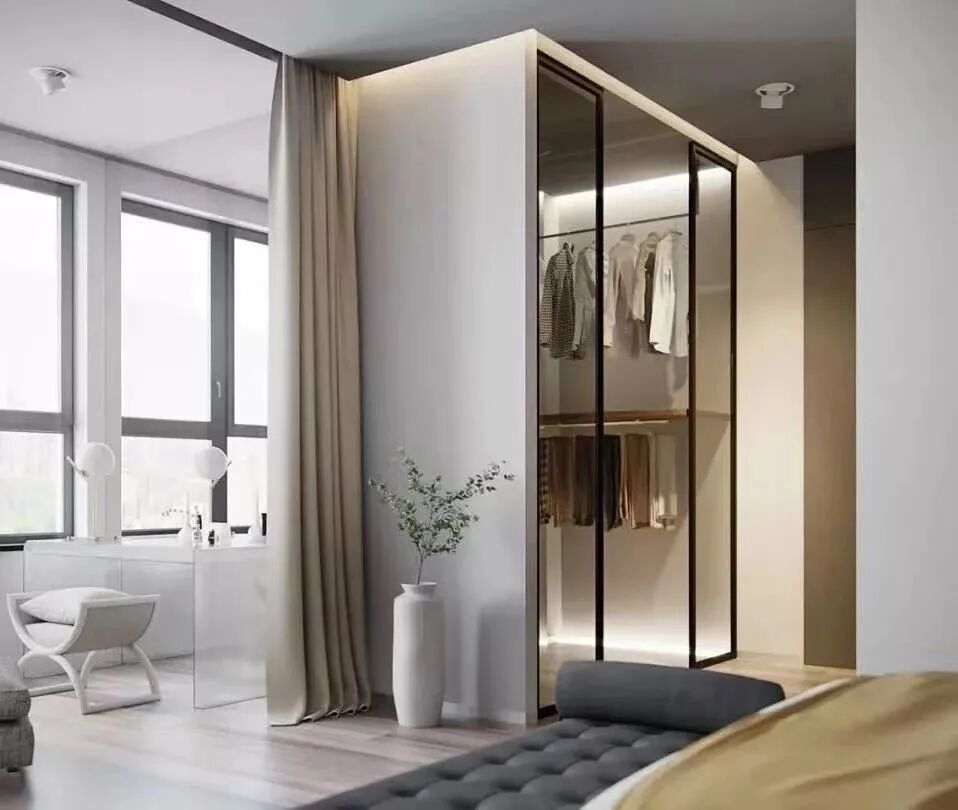 卧室衣帽间:与传统衣柜相比,入墙式衣柜的空间利用率高、和谐美观,更避免了上方空间的卫生死角,光滑的柜体表面吸尘器走一遍就ok。、