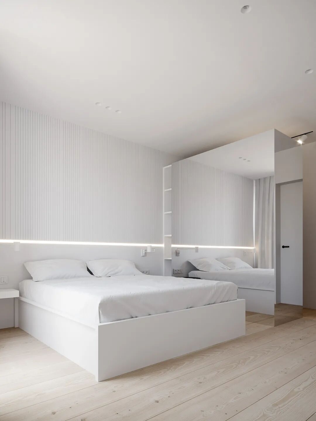a、如果卧室深度足够,可以用一字型衣柜与卫生间隔断开,休息区完全独立,很好地解决了床对卫生间的问题。▼