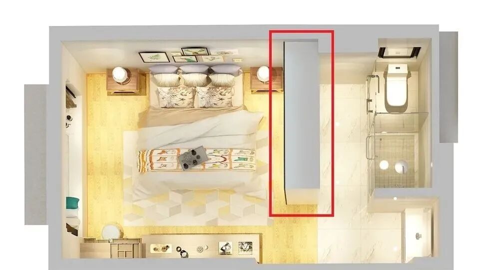 2、如果门和床都改不了,可以试试用柜体隔断的方式来解决。