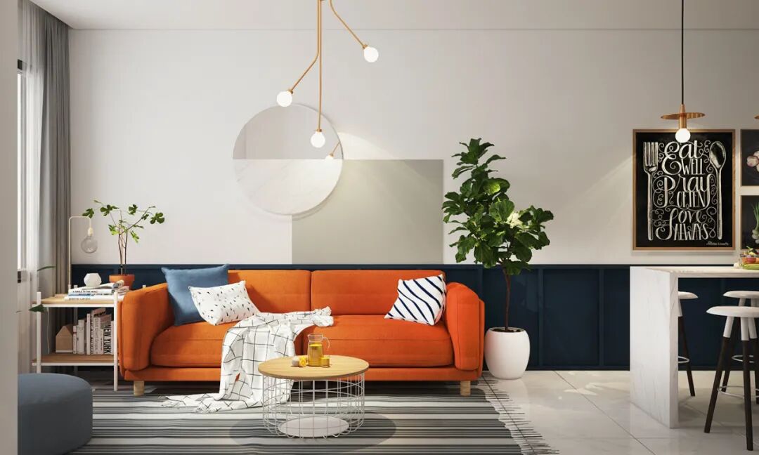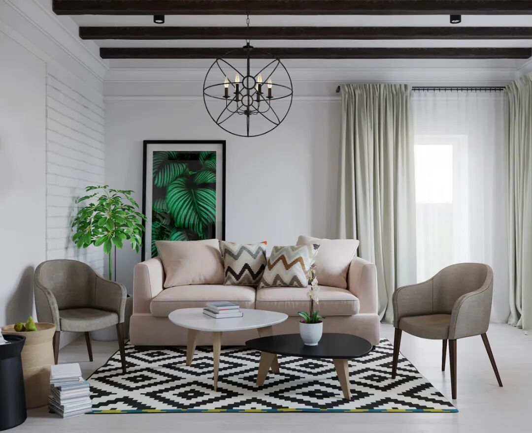 搭配图案醒目的靠包、窗帘、地毯等,来人为地营造空间的氛围,从而忽略房间的不足之处。