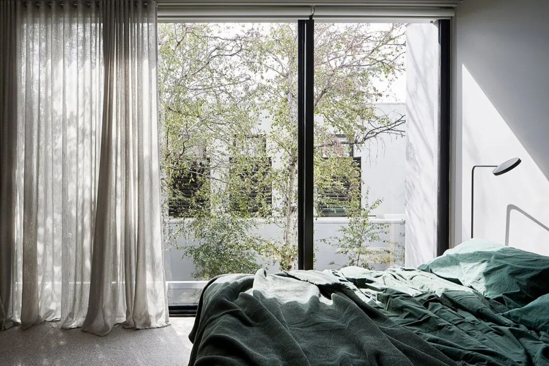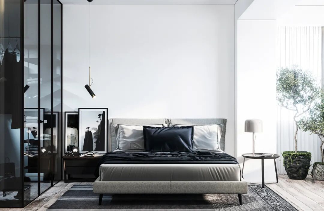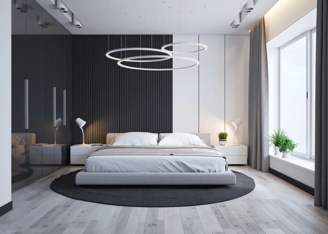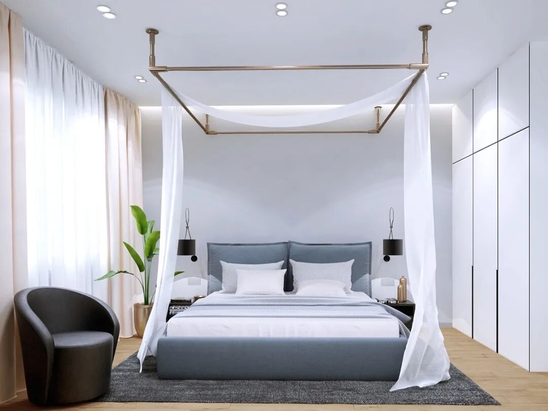 在地板上横向使用直线图案地毯,墙上的不规则线条、垂挂下来的纱帘也能延展空间,使面积不大的卧室不至于显得压抑。