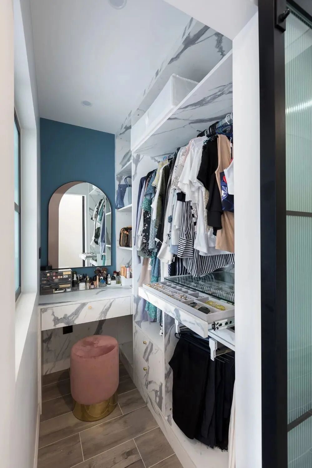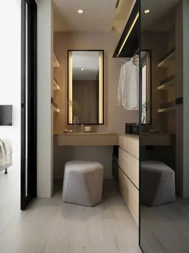 衣帽间有了,怎么能漏了梳妆台呢?有梳妆台的衣帽间空间使用起来更为方便,不论是挑选衣服、化妆、发型都能在同个空间完成,各种美妆用品、电棒卷、吹风机等小家电也能在此收整,让出门时不再手忙脚乱。