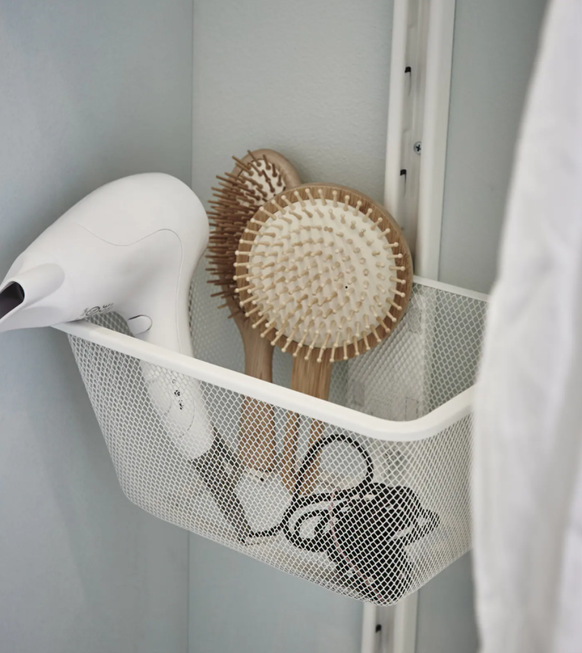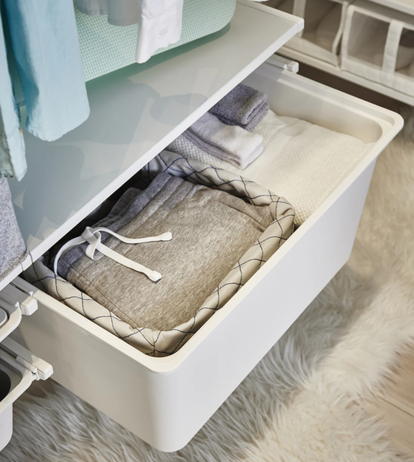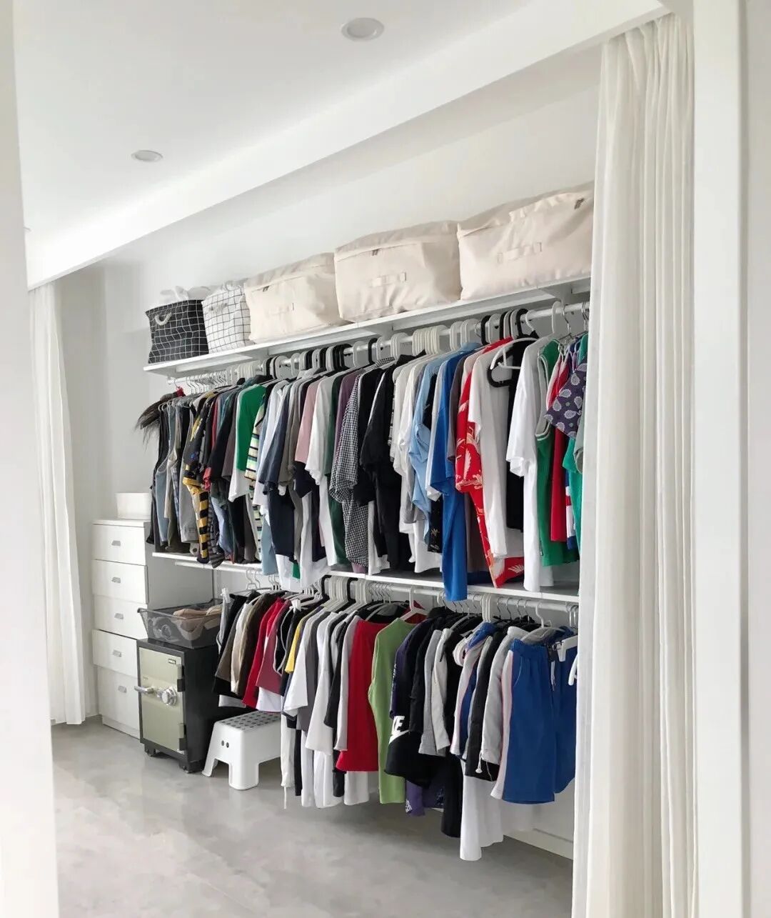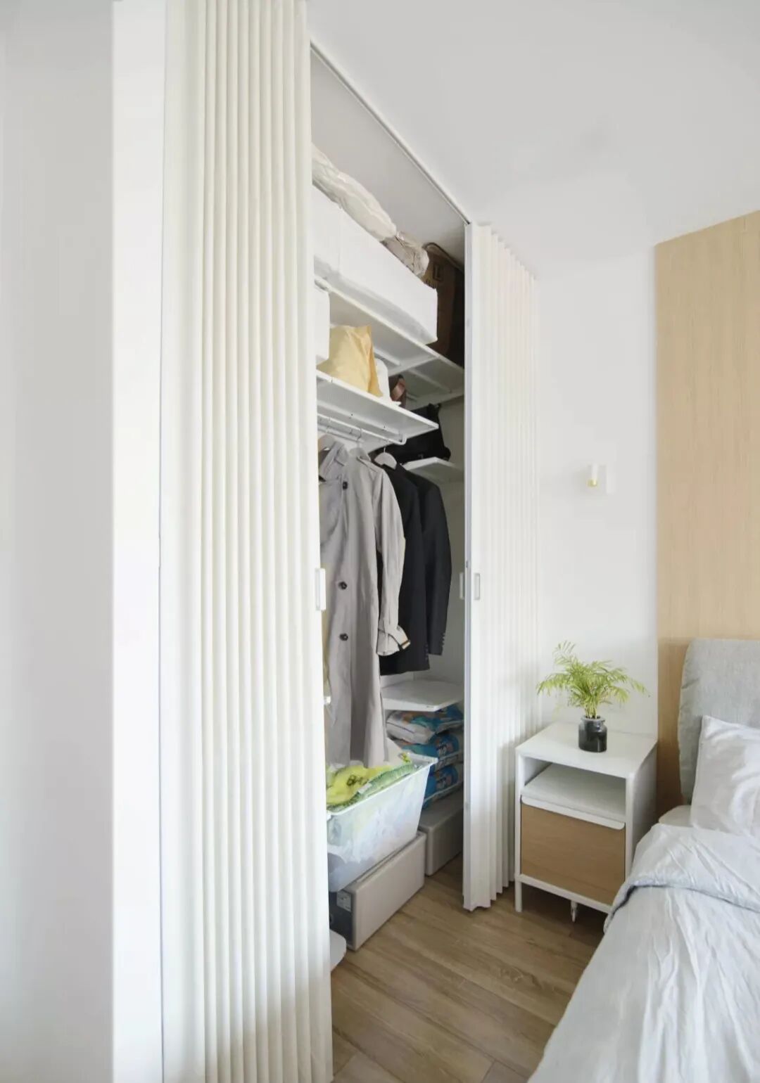 如果担心收纳量不足,或是需要放置折叠式衣物,则可搭配使用壁挂置物架,或在下方加装矮柜、收纳盒,满足收纳需求。