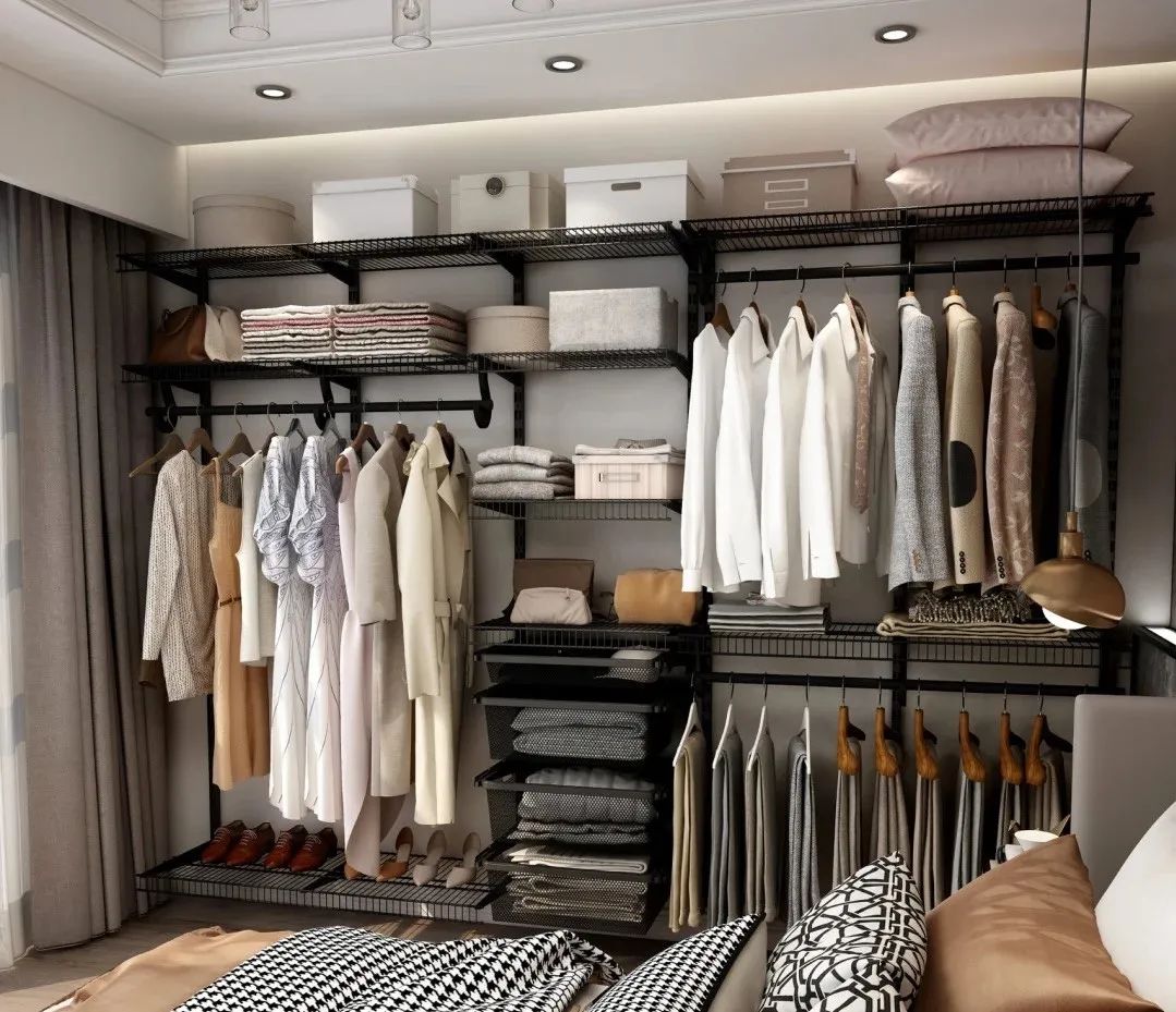 其方便增加或调整配件的特点,让很多屋主觉得喜欢;无论是加装搁板、挂钩、抽屉、密网篮都相对容易,赋予组合式框架衣柜更完善的功能。