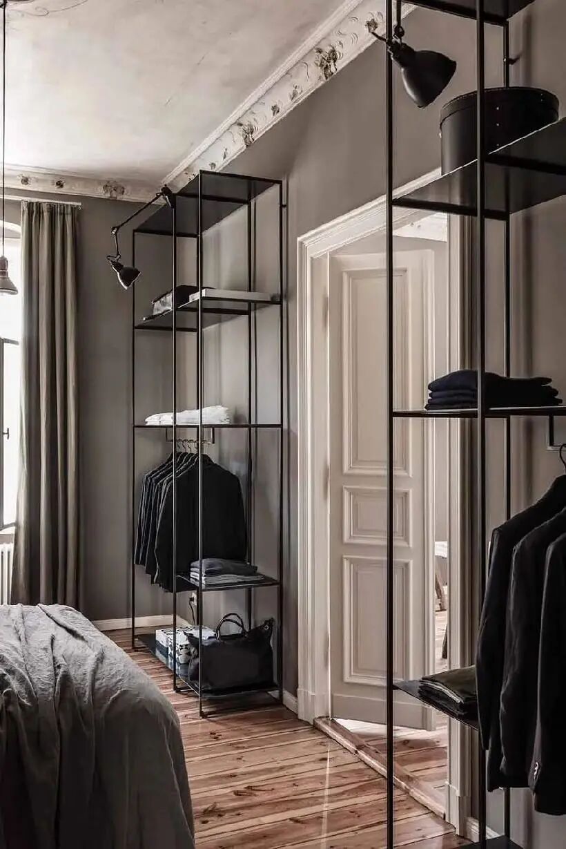 具有设计感的开放式框架衣柜,也是很好的卧室装饰品,还能结合使用需求,增减搁板、桌板、收纳盒,为小卧室增添化妆台、书桌等功能。至于具体如何操作,一起来瞧瞧吧!