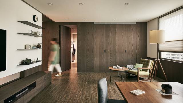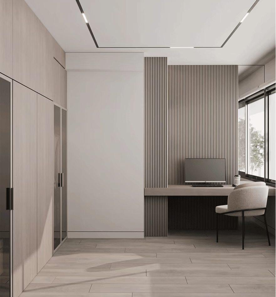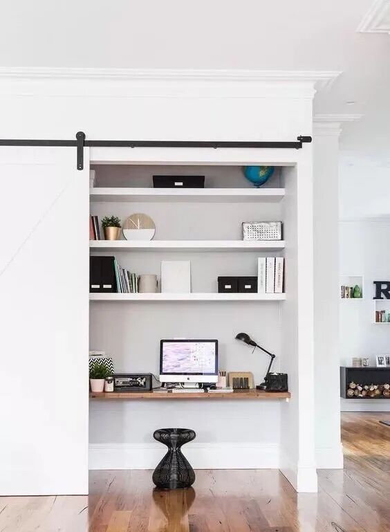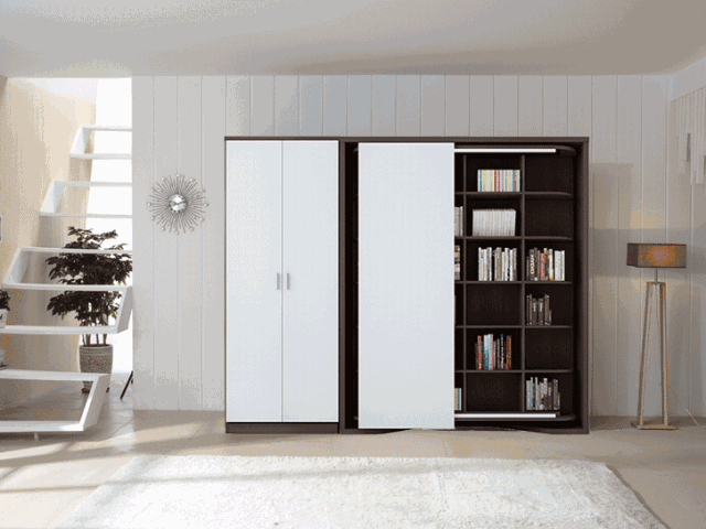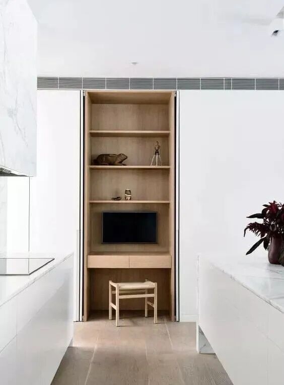 独立书房对于普通家庭来说可能略有点奢侈,可以利用柜体将其藏于其中,一拉一合实现功能切换。