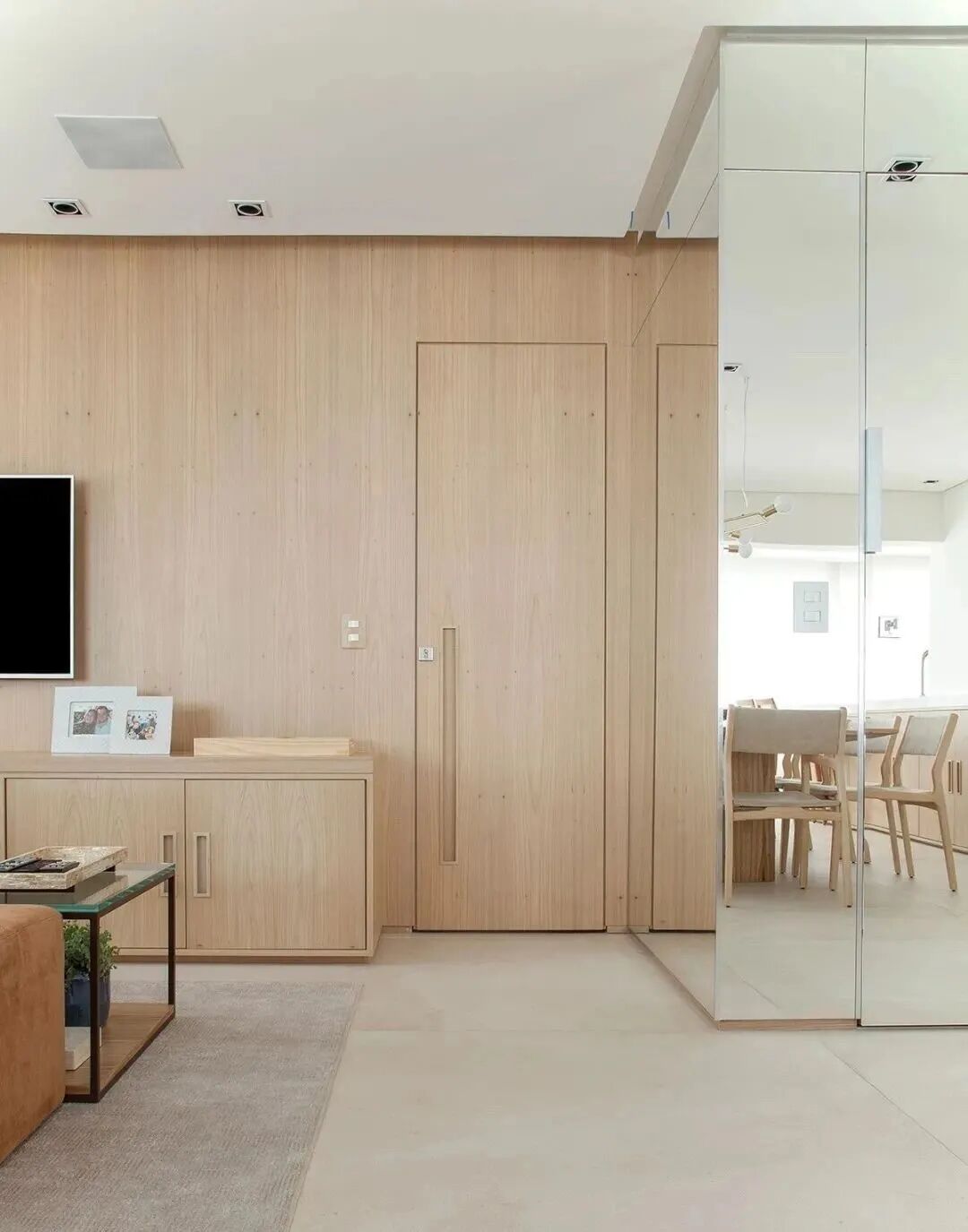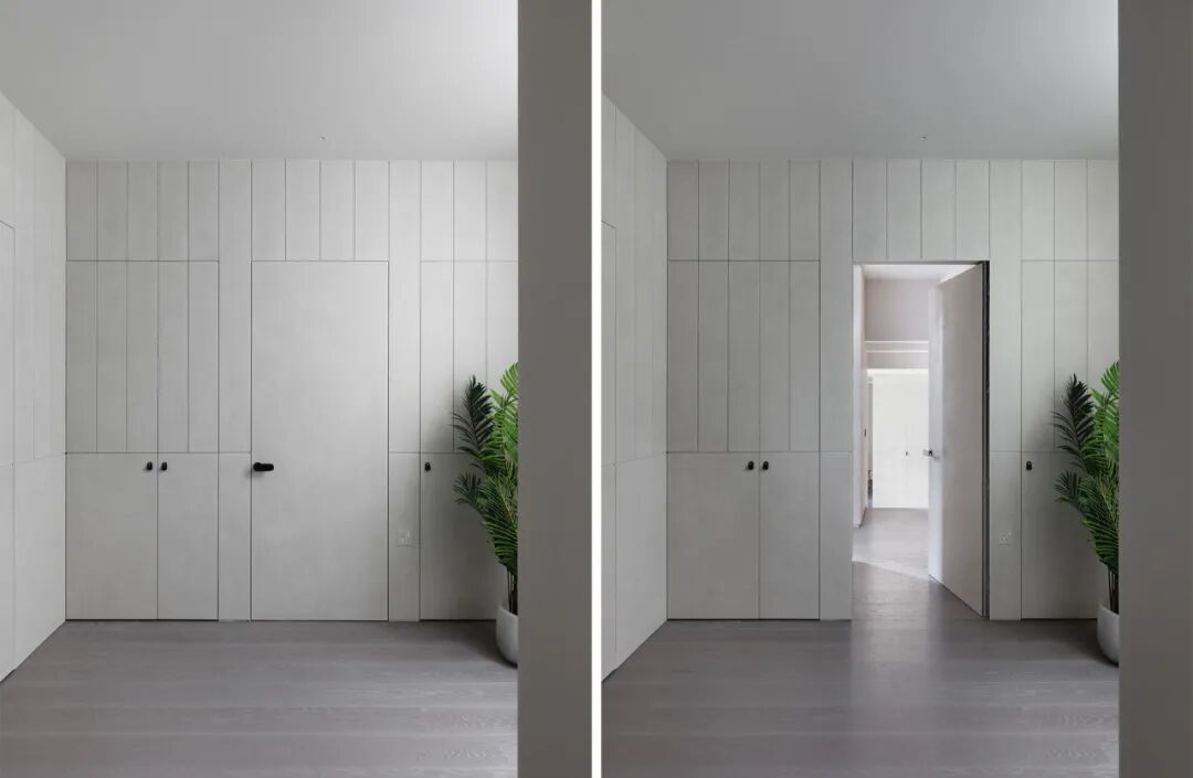 它没有门框和把手,利用壁纸、乳胶漆、护墙板等伪装成墙或柜,在保证私密性的同时,也为家带来了几分神秘感。