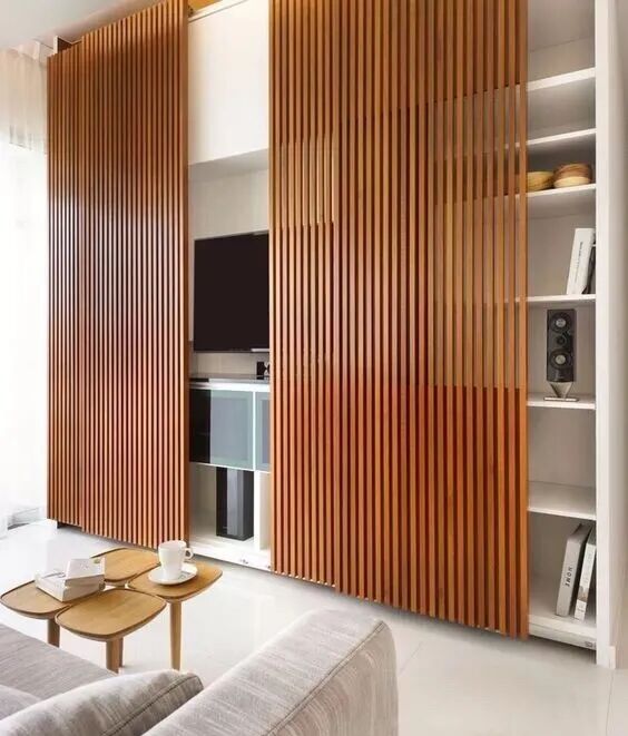 电视藏到柜子、推拉门或吊顶里,用时打开,平时收起来,不占用空间。