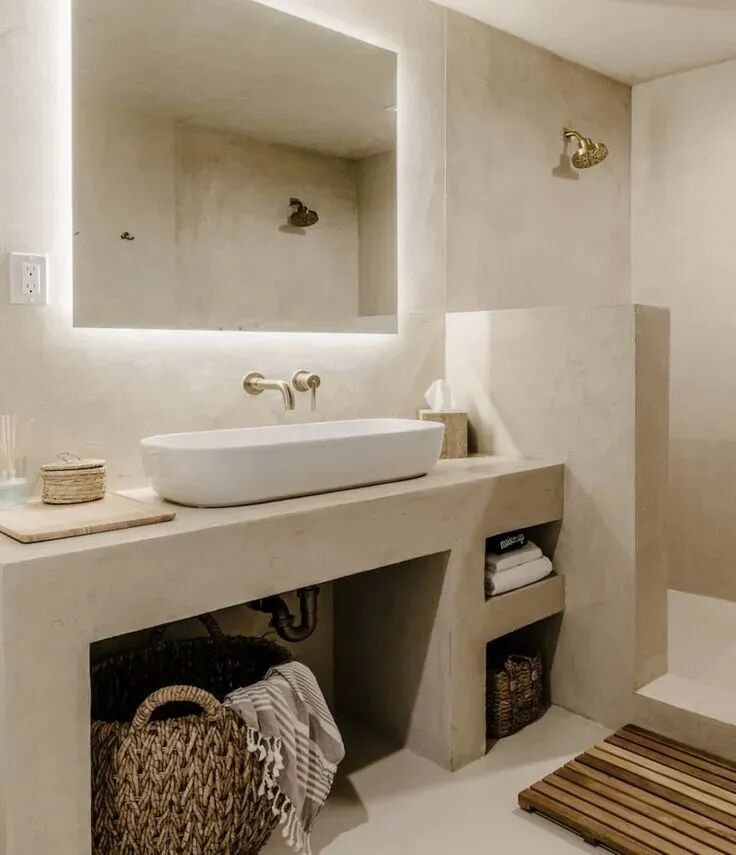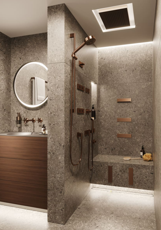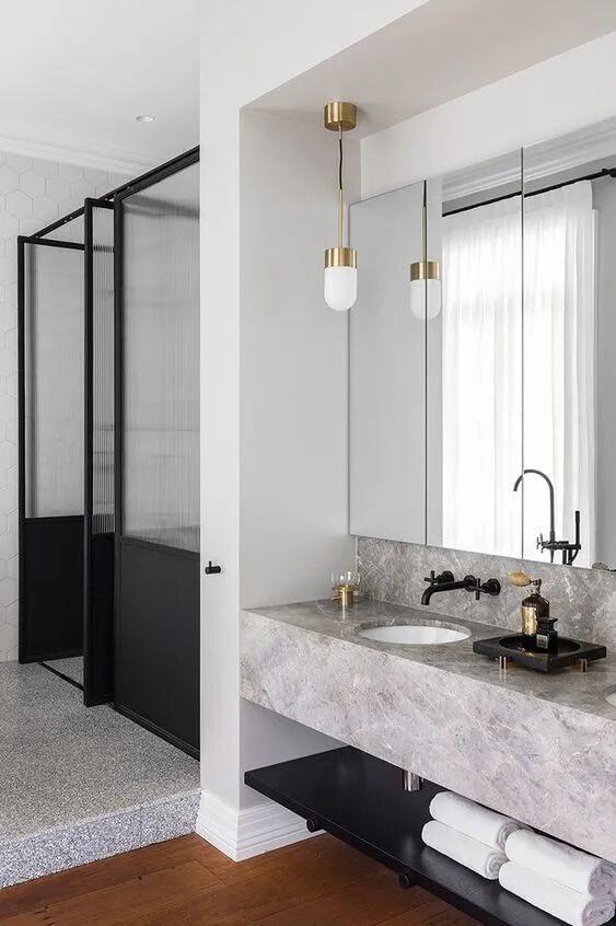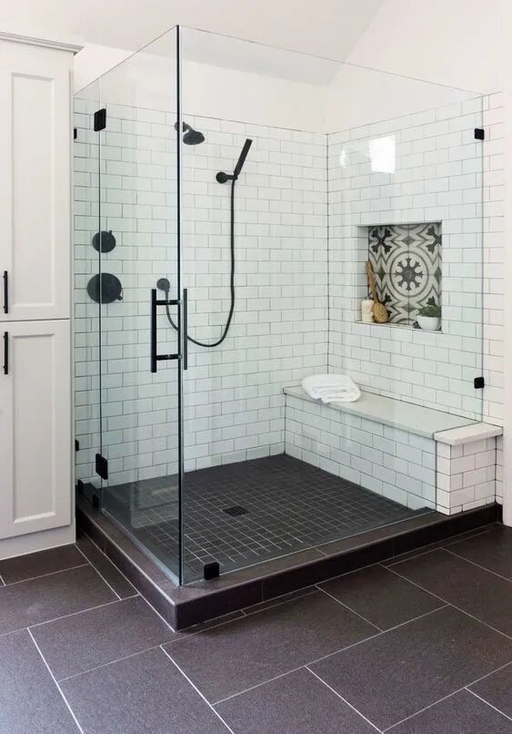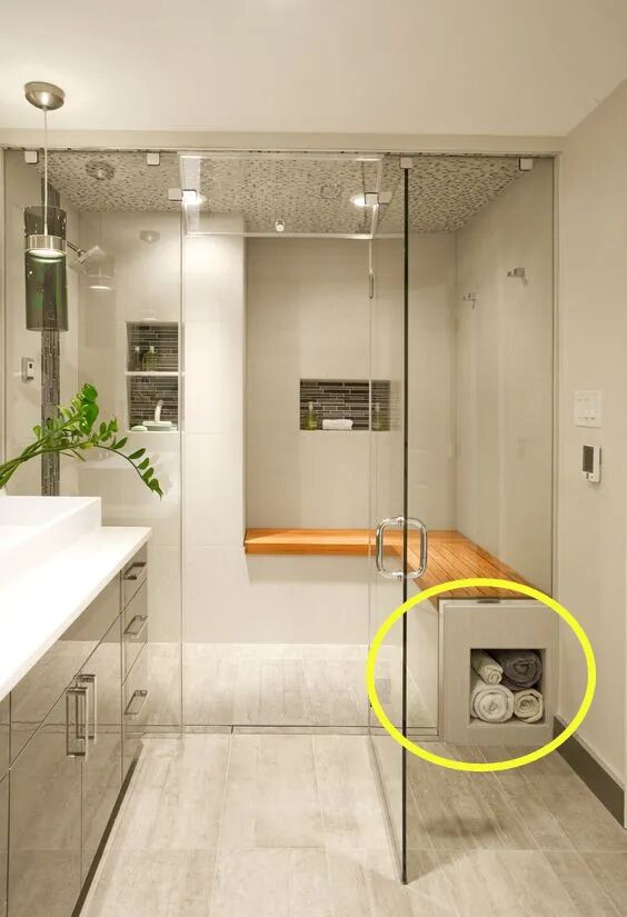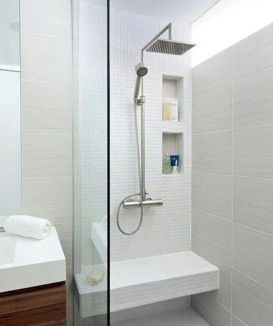落地式淋浴凳会占用一定地面空间,一般将其装在墙体拐角位置,或掏个洞收纳洗漱用品,充分利用空间,减少卫生死角。材质上多选用大理石、瓷砖,结实耐用、易打理、好搭配。