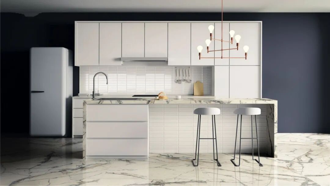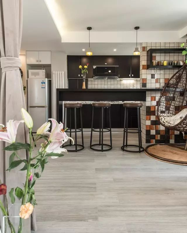 地面选择防滑、耐污、耐高温效果更好的亚光釉面砖或亮面砖,喜欢实木质感的可以考虑木纹砖,减少油烟吸附。