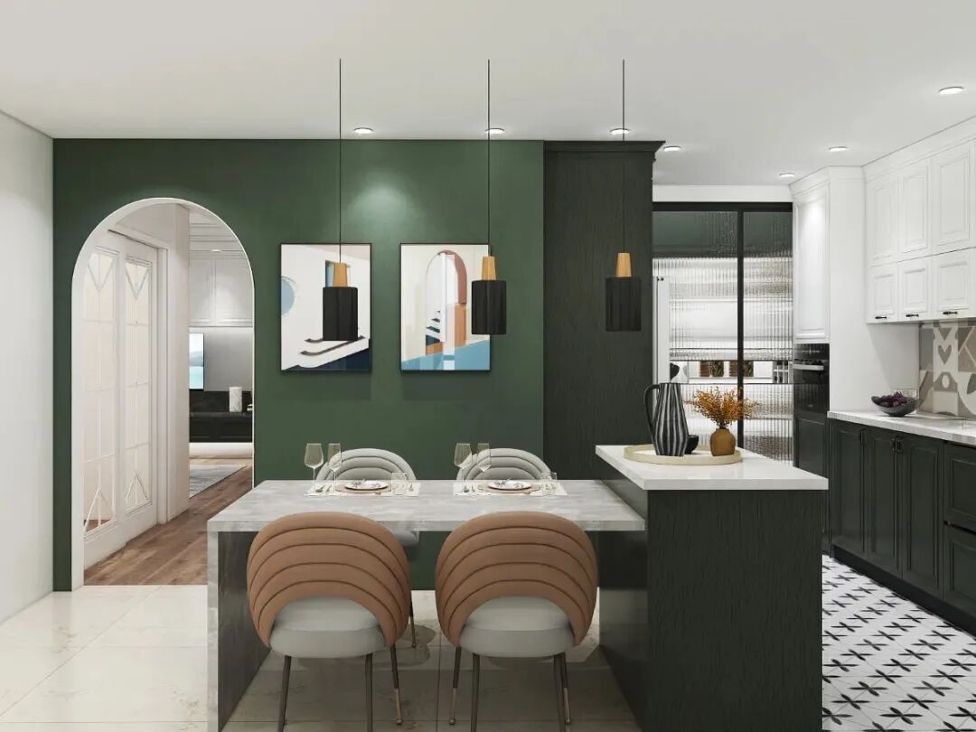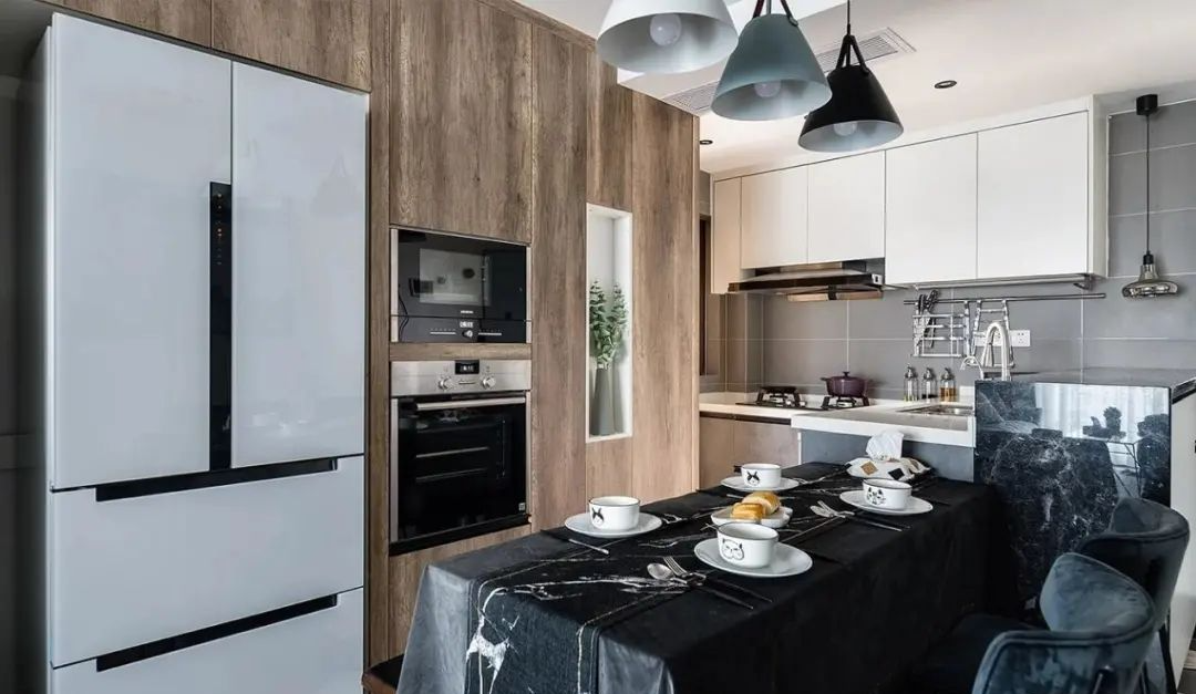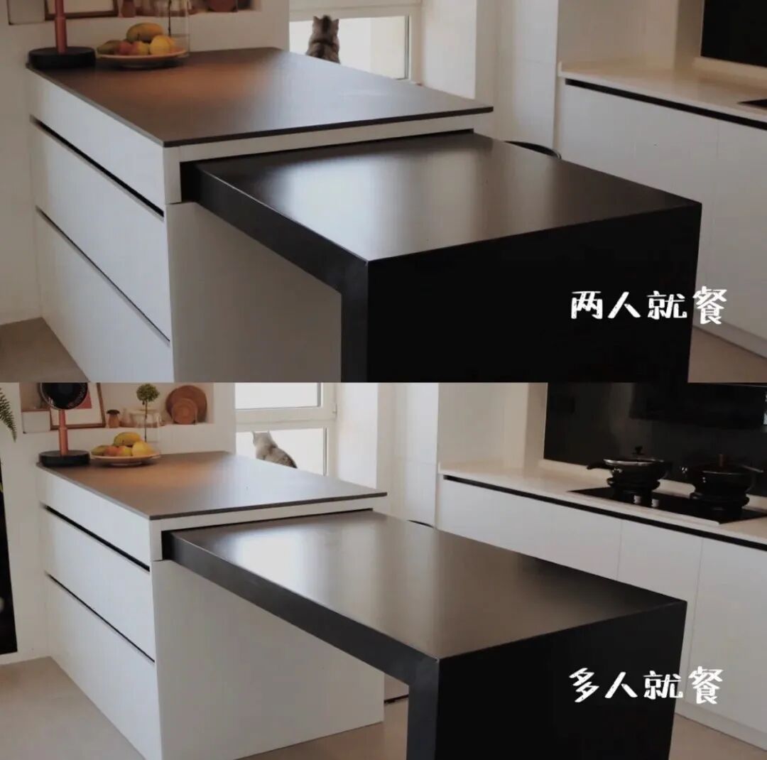 还可将餐桌融入岛台,设计为抽拉式餐桌。