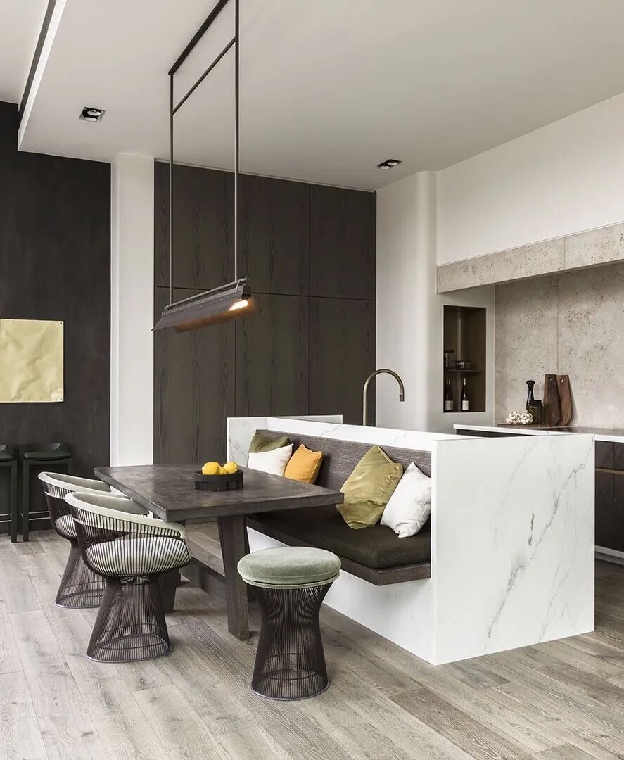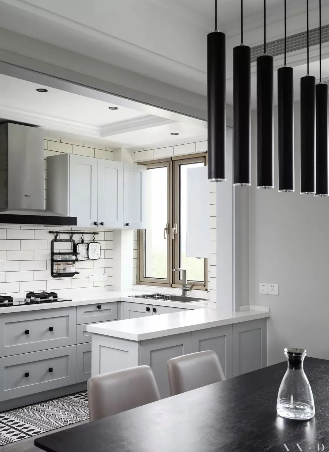 在岛台上设置卡座,从整体造型上来看极具几何感和艺术气质。从实用的角度看,能更加节省空间的面积,提高空间的利用效率,让空间在视野上更加开阔。