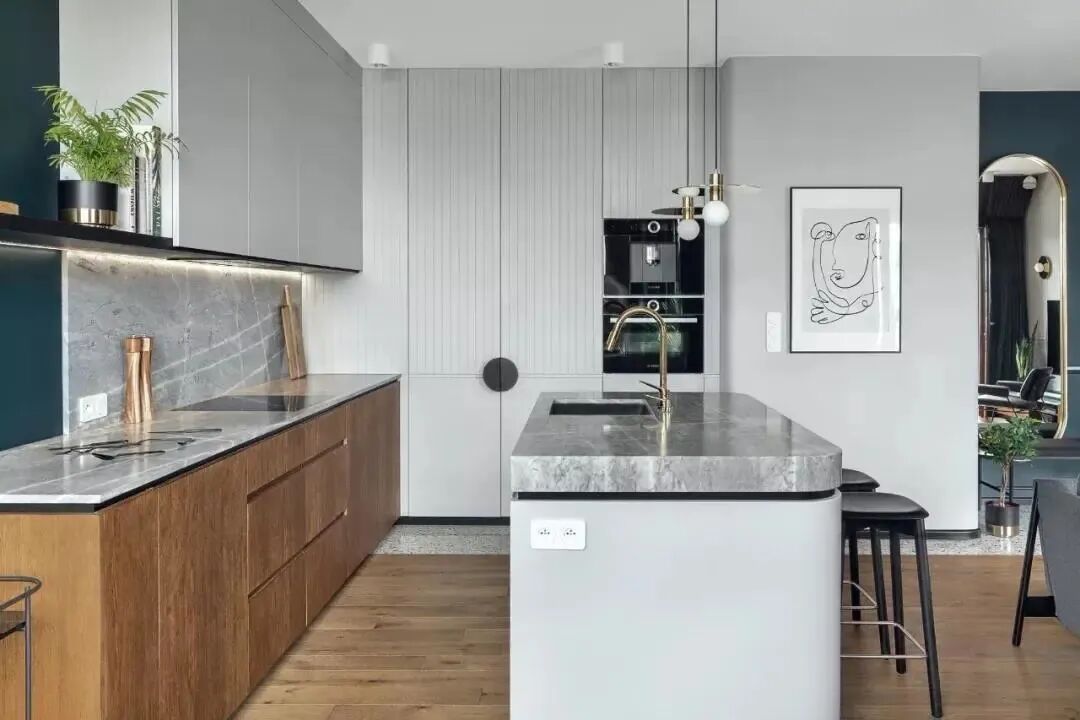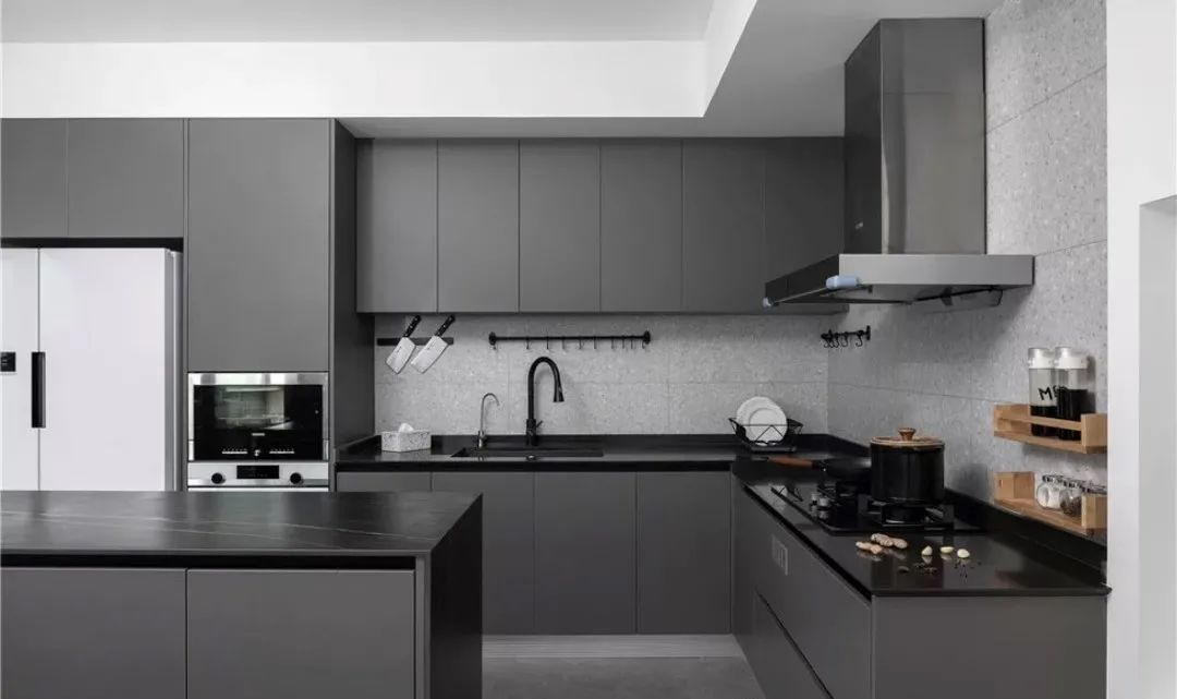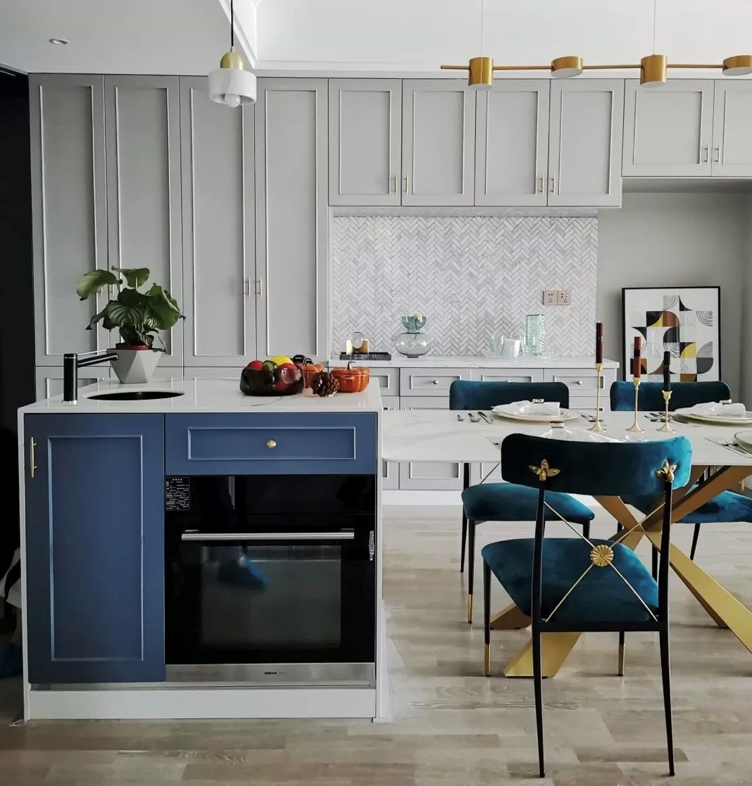 岛台可以充当一个厨房补充操作台的角色,加工处理无需集中在同一操作台,将水槽或是烤箱嵌入岛台,在厨房台面煮菜的同时,岛台既能作洗菜切菜,又能做西厨。一家人围着岛台制作面食的场景,也是令人无比羡慕了。