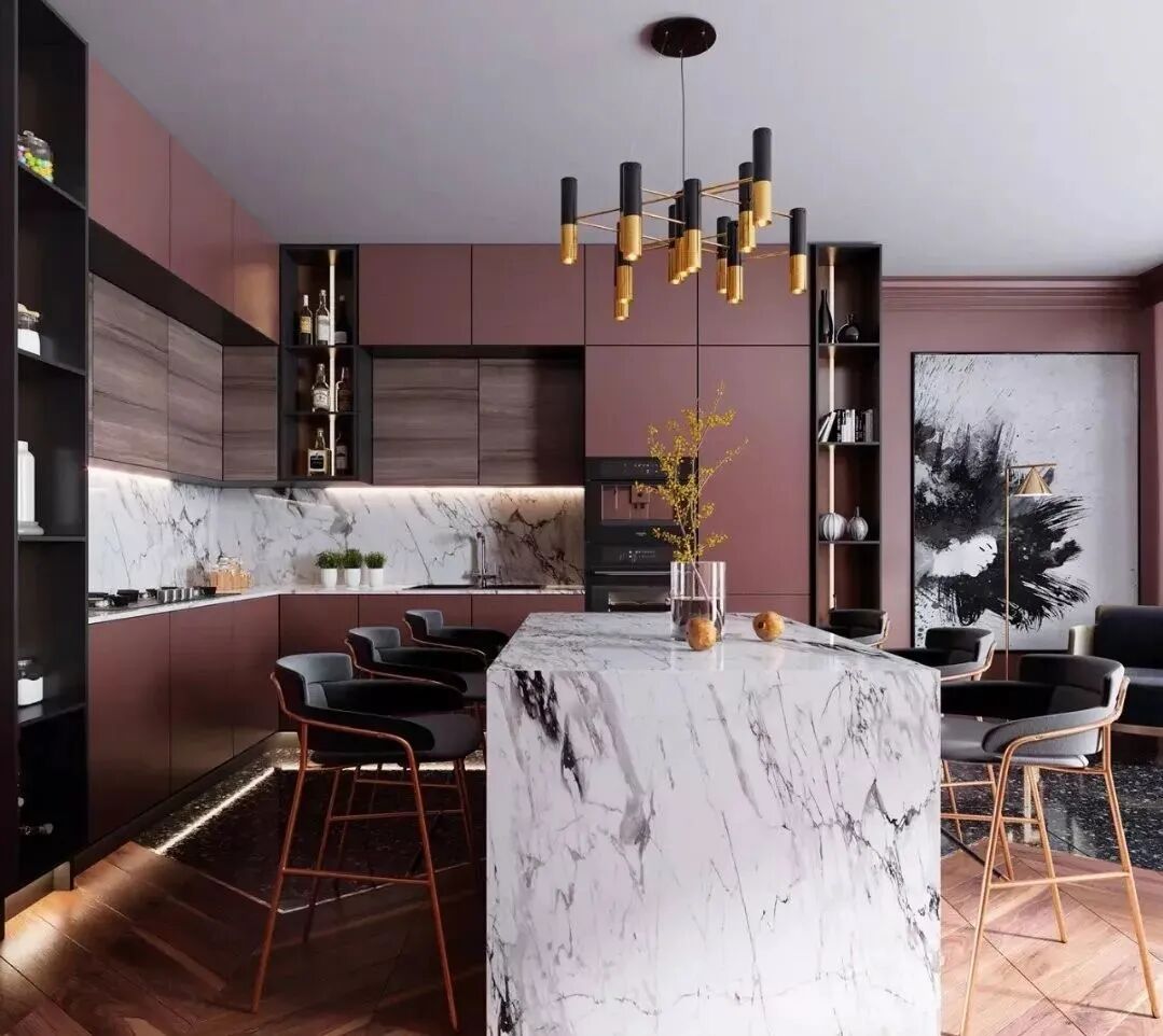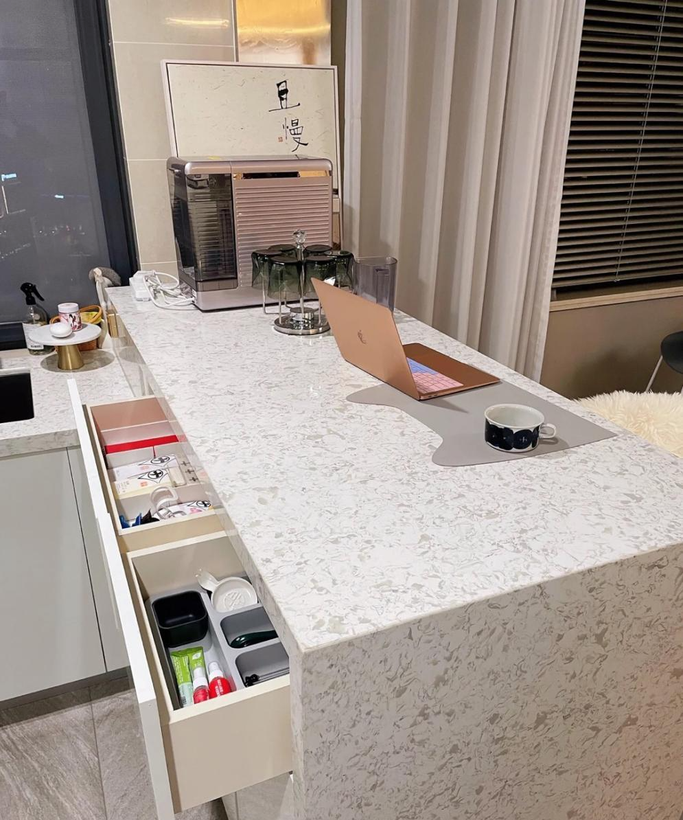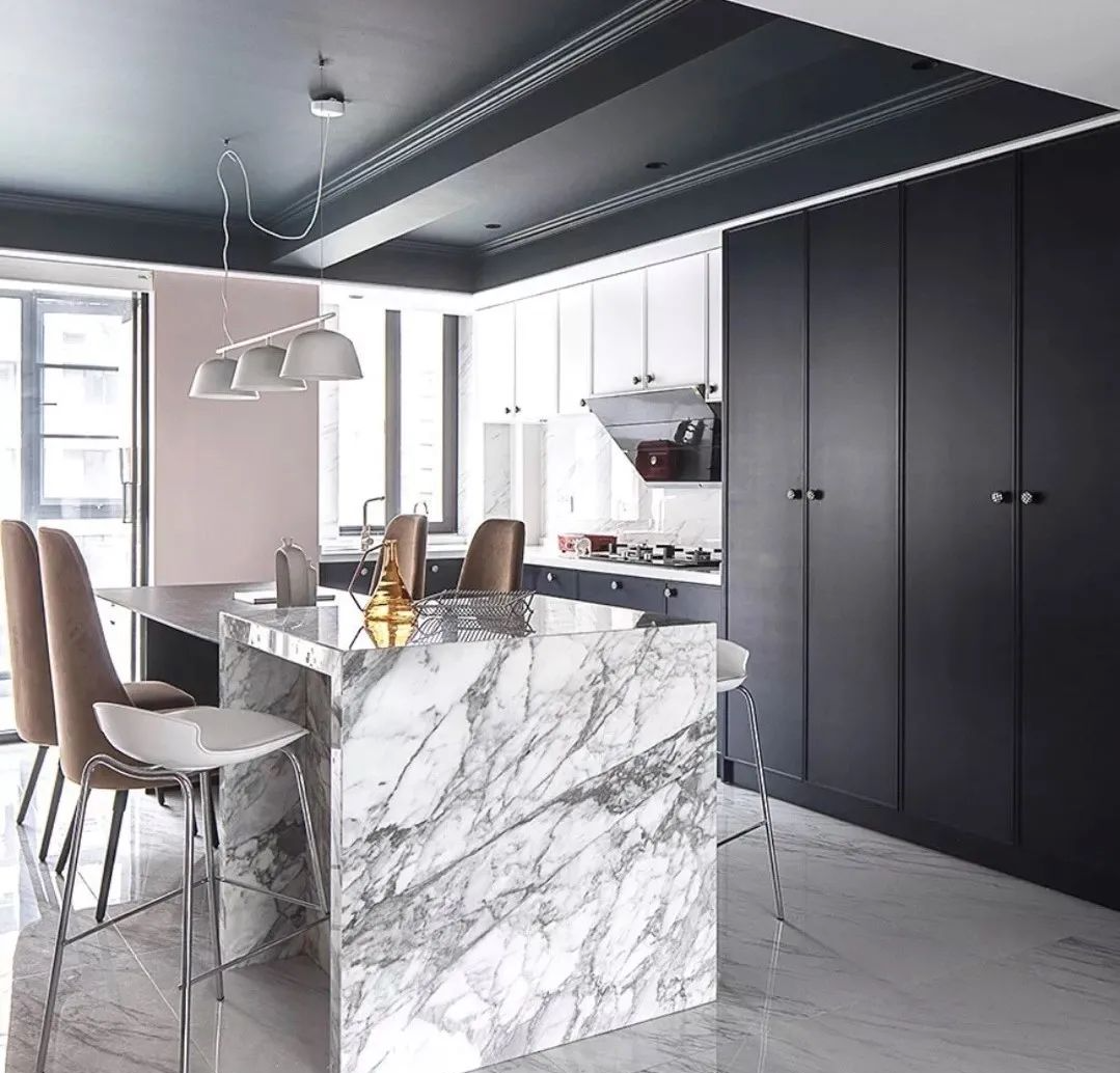 岛台的材质大多与橱柜台面一致,但由于位置突出醒目,在台面的选择上,岛台可以更具装饰性。作为料理台,选用石英石居多,也可像专业厨师一样选用不锈钢。追求壕气就用大理石,实木台面,死贵死贵的......