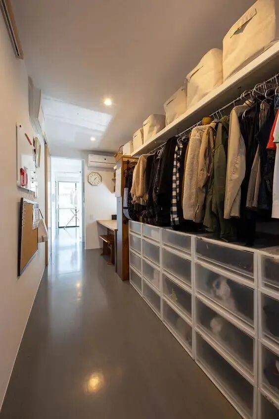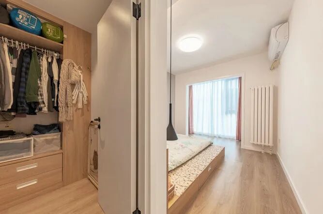 无论是嵌入式壁橱还是步入式衣帽间,相比成品柜和定制柜而言都更加省地能装,成本也比低至少一半,最关键是适合懒人,只穿一天的外套、出差回来时的行李箱、刚拿回来的快递随手一塞,帘子一拉完事。