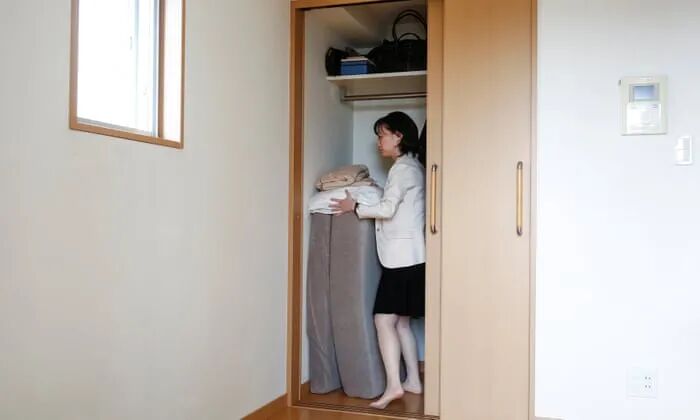 嵌入式壁橱:日本人降低柜体存在感又不耽误收纳的办法是,靠墙打个衣柜框架做成嵌入式壁橱(类似嵌入式衣柜),加上折叠柜门、帘子或者干脆不装。