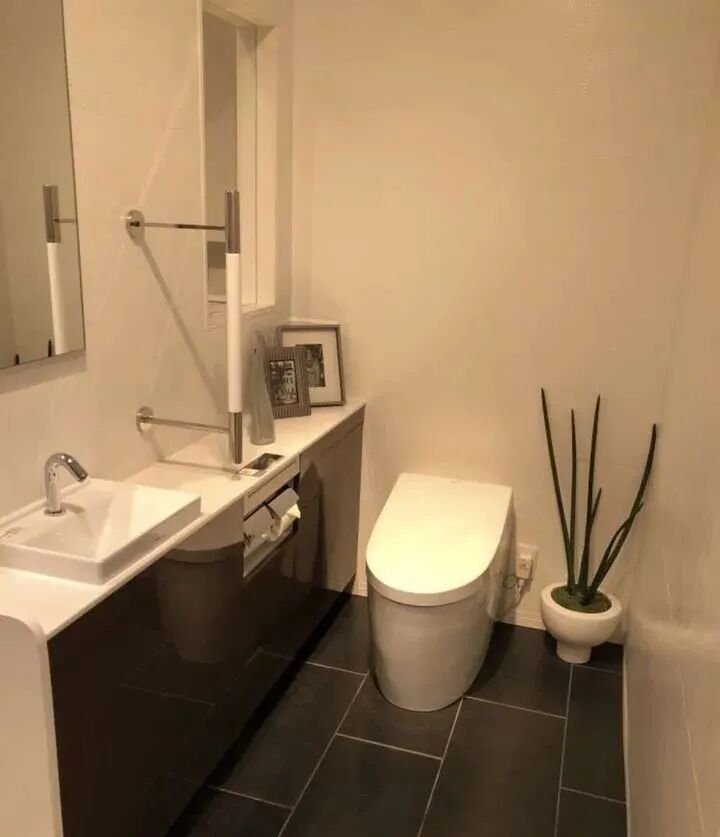 日本卫生间的马桶区会加装洗手台,方便洗手,以及早高峰时使用,因为在建房前已经考虑好了装修的问题,比如上下水。