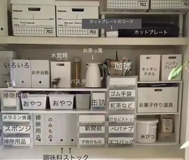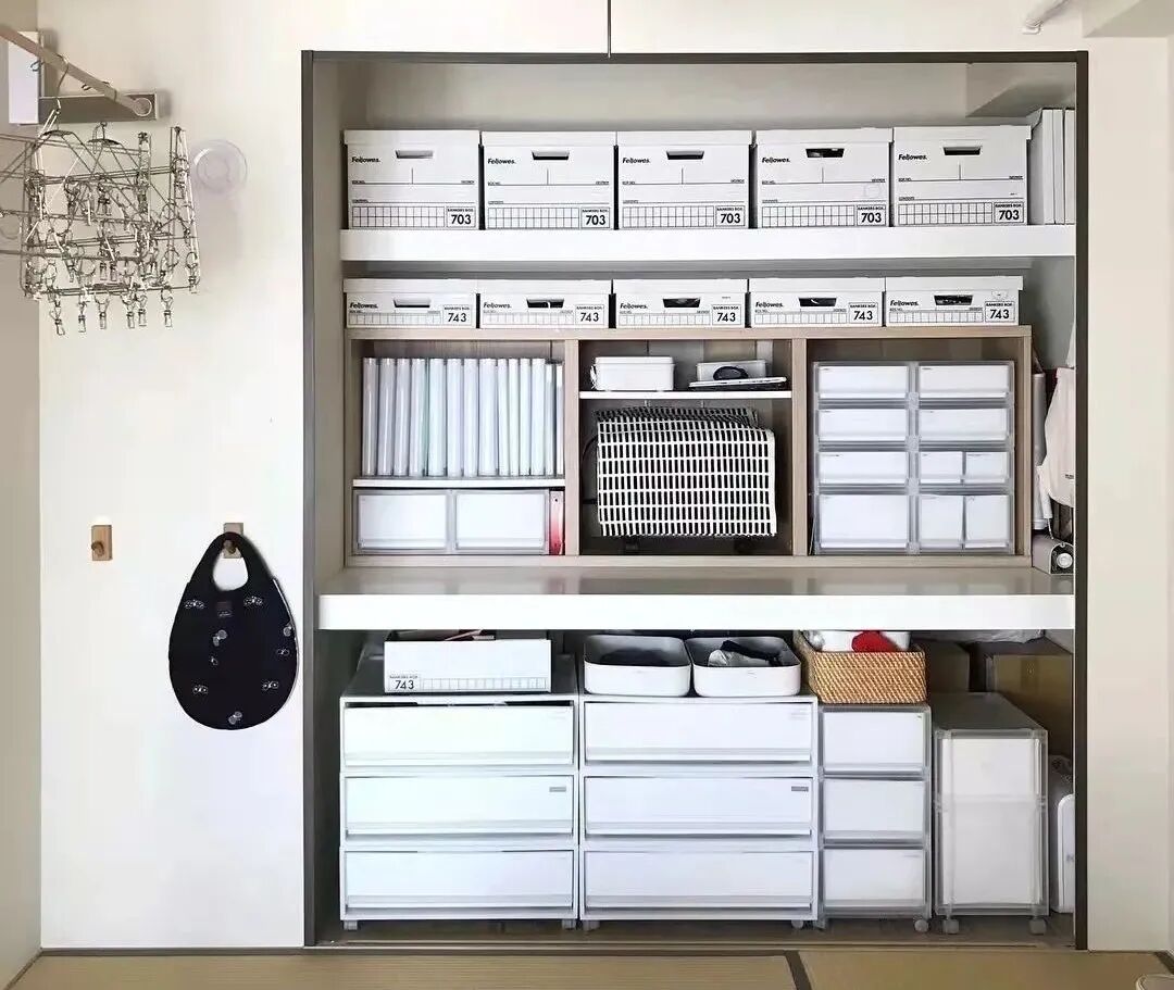 一般会根据物品大小、使用频率,分区、分类摆放。