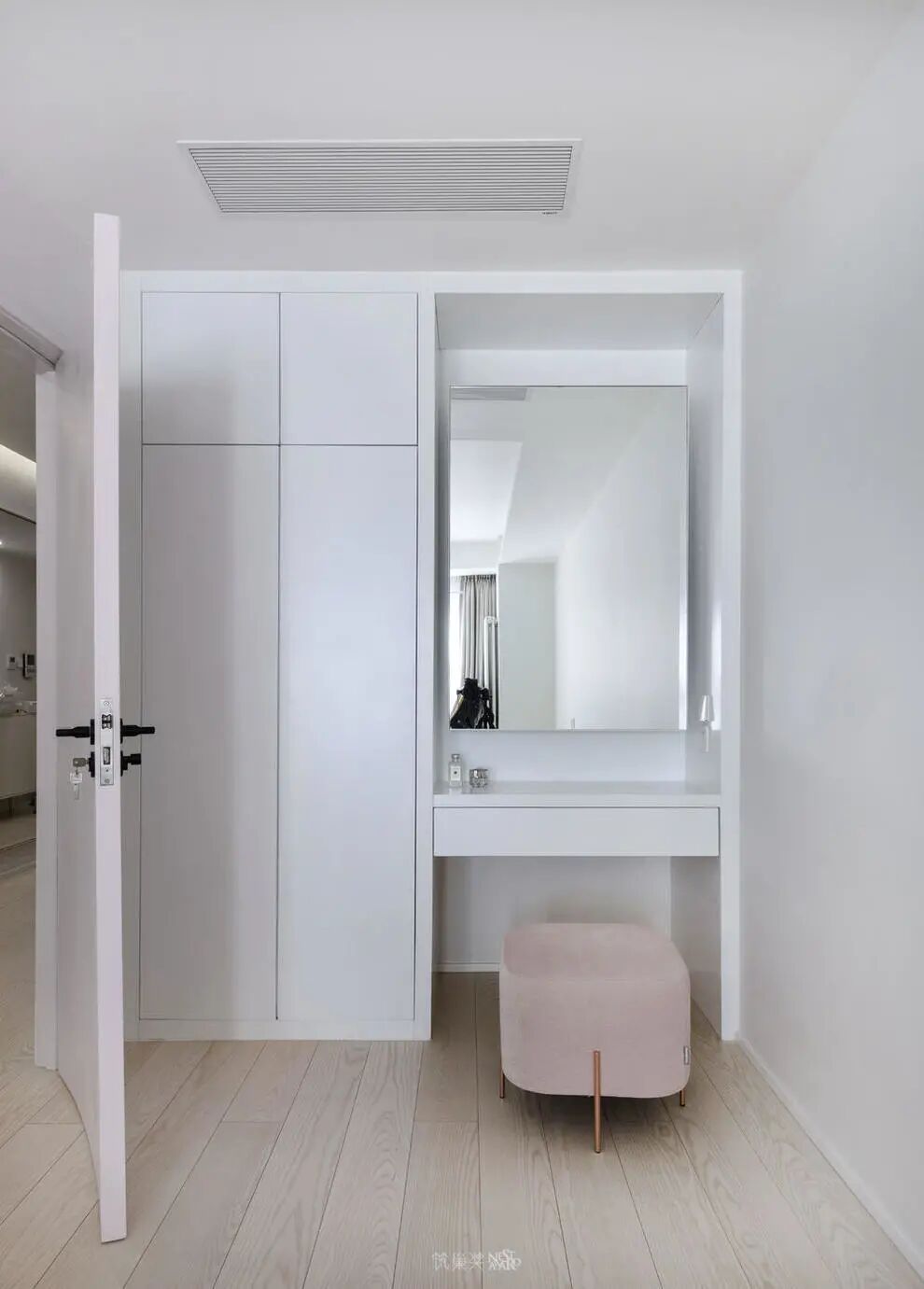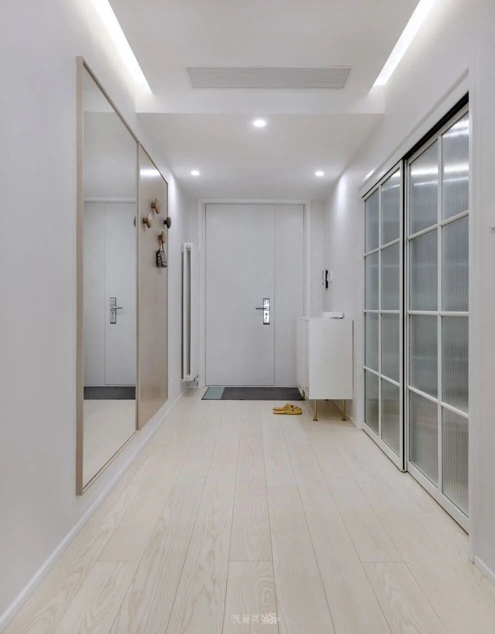 玄关左侧增添一扇推拉门隔出衣帽间,便于进出前进行更衣,同时满足屋主衣物收纳的需求。与衣帽间门相对的墙上设计了穿衣镜和临时挂衣区。