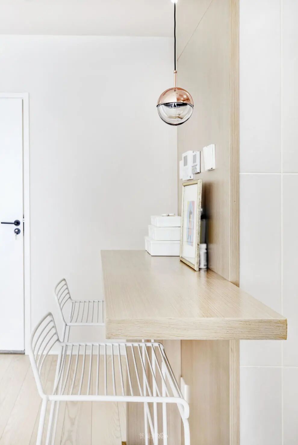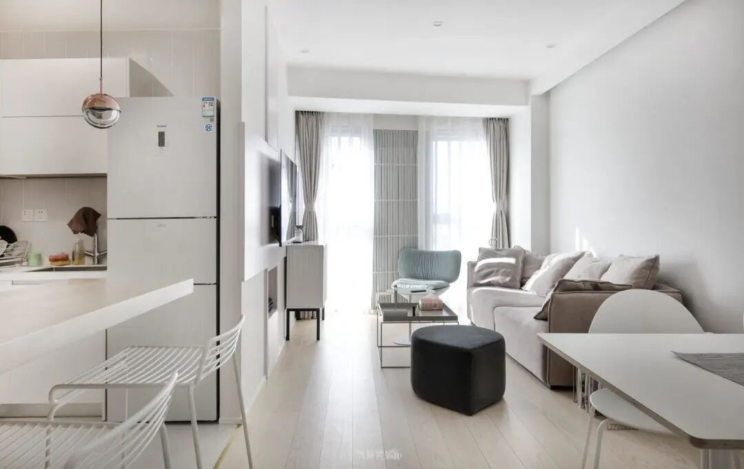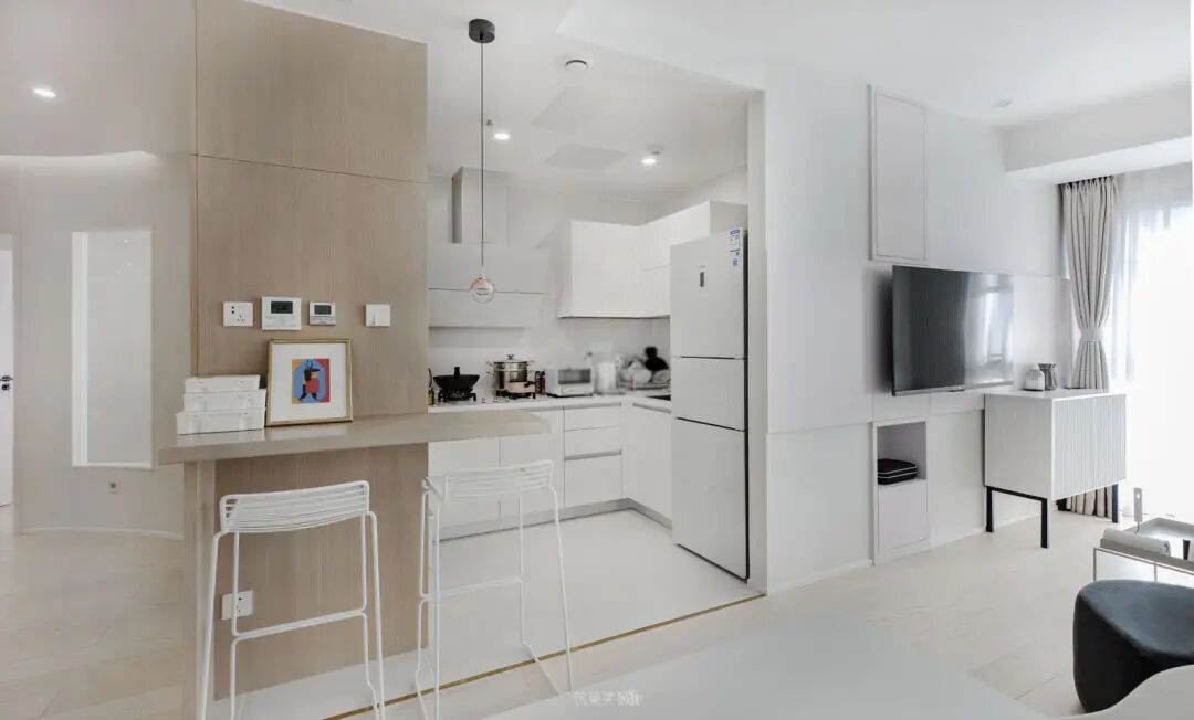 厨房一侧留出吧台区域,可以用于简餐,也可以当作办公桌台。