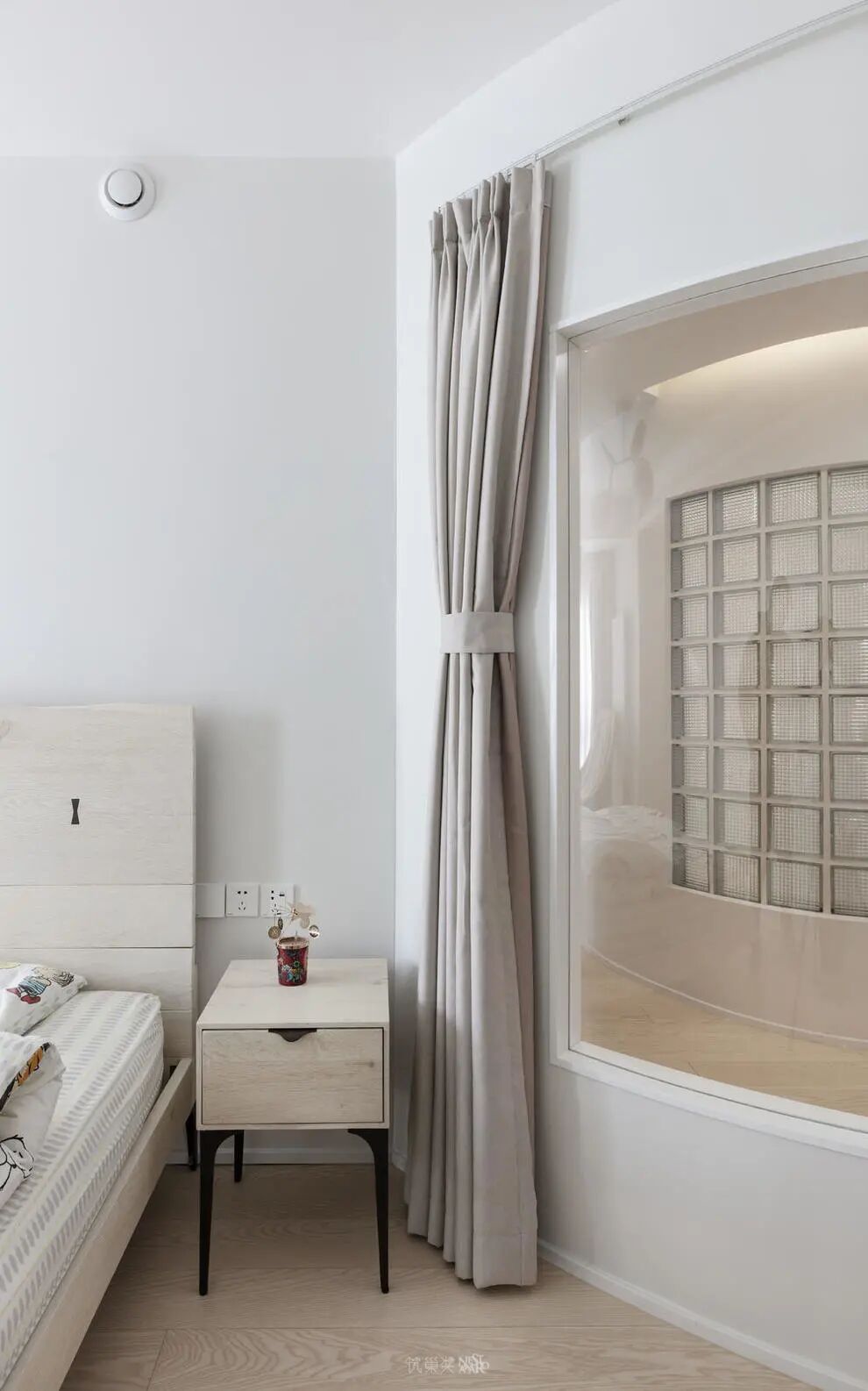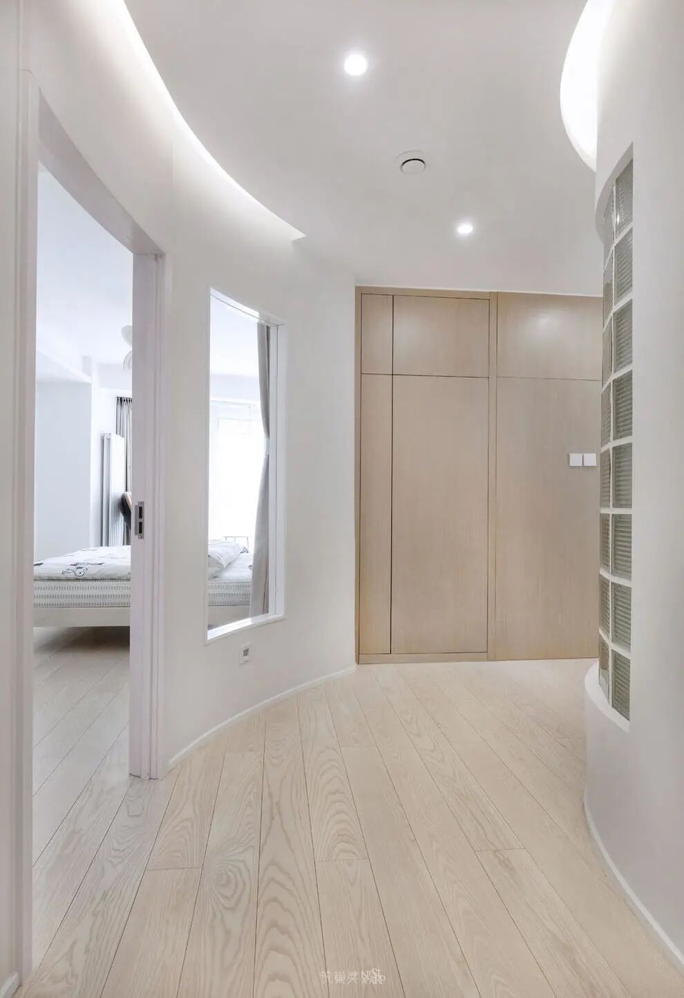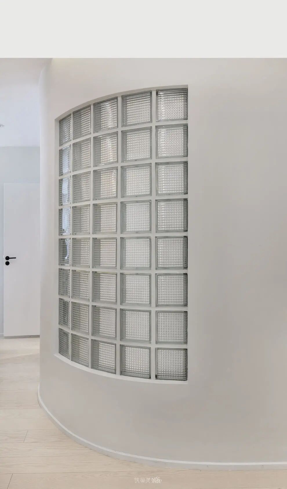 弧形墙面留出透光窗口,让自然光线可以通达洗漱间,与之相对的洗漱间局部墙面采用玻璃砖砌筑,有效的将部分自然光照进入。也缓解了走廊通透性差的问题。