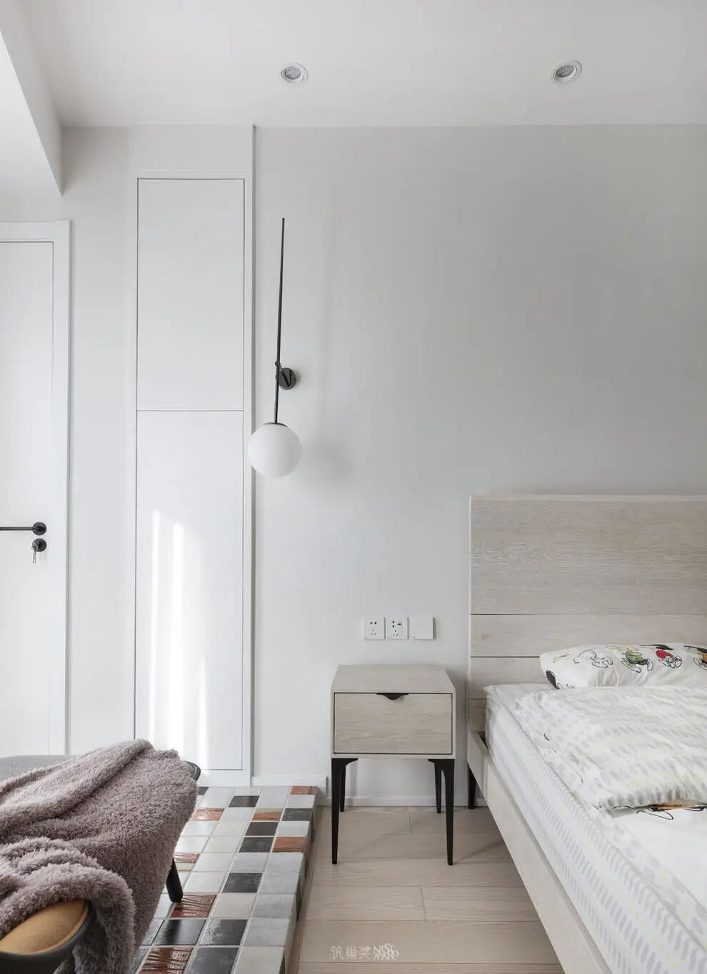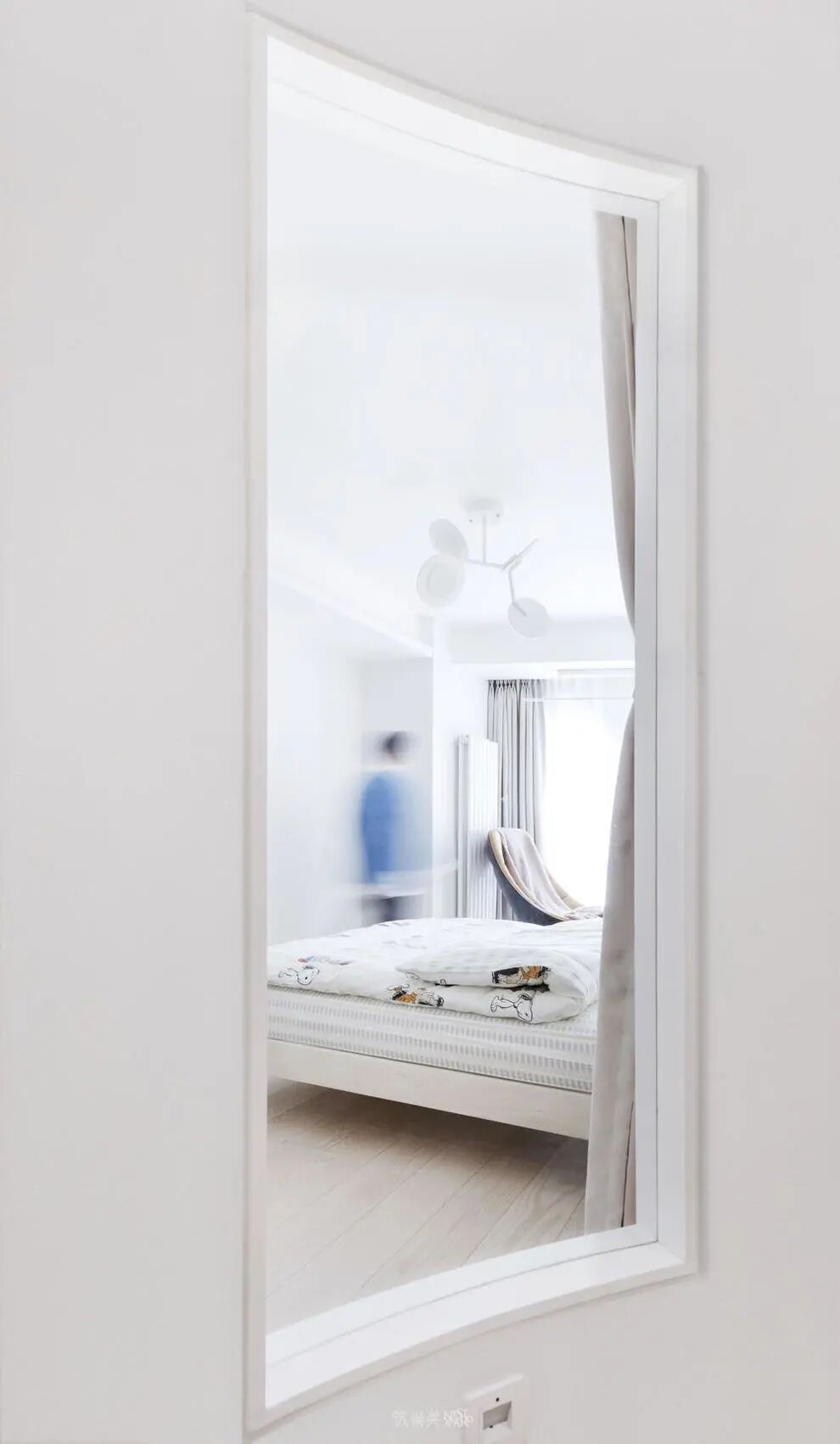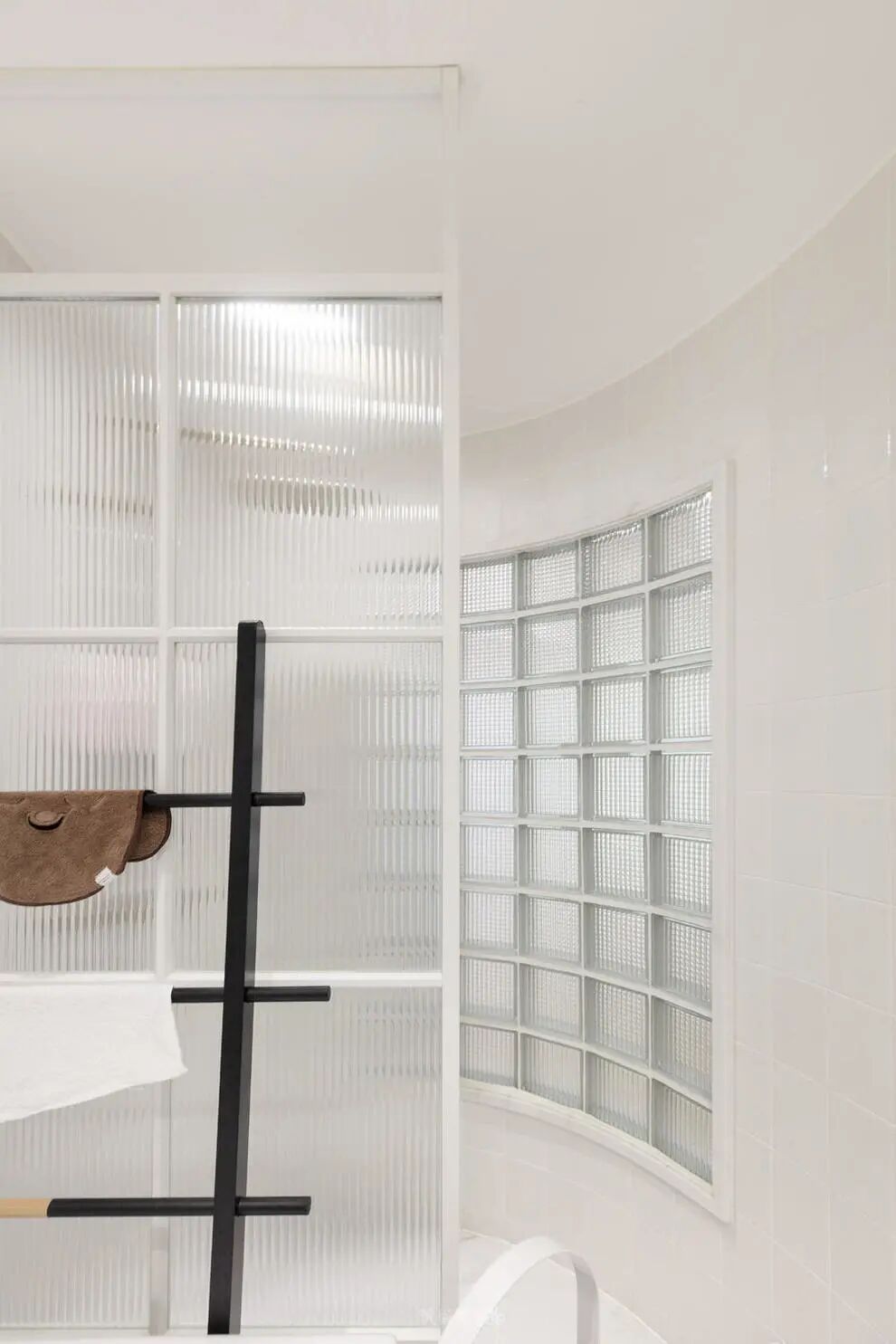 弧形墙面留出透光窗口,让自然光线可以通达洗漱间,与之相对的洗漱间局部墙面采用玻璃砖砌筑,有效的将部分自然光照进入。也缓解了走廊通透性差的问题。