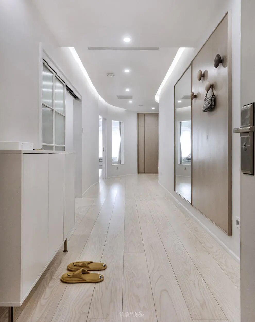 玄关改造后形成长条的弧形长廊,顶面结合灯光形成导向指引。以流动的造型设计增强区域之间的联系,起到放大空间的视觉效果。比起四四方方的空间设计,能在一定程度上柔化空间棱角,为空间注入温度。