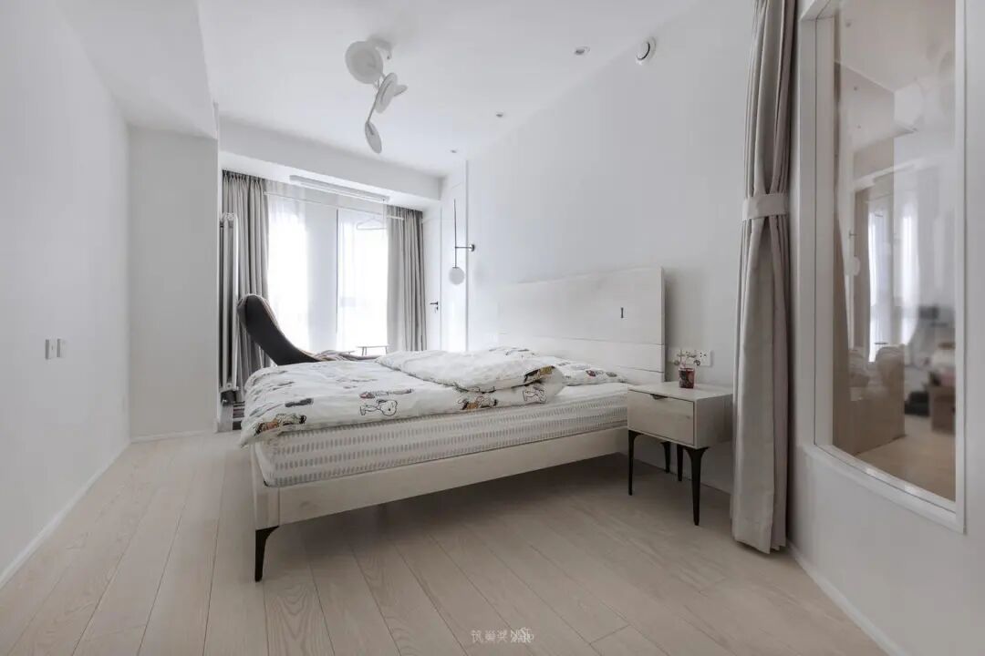 即使只用到了白色和木色,也营造出了层次分明的质感。在色调上为了保持和谐,几乎所有的家居用品亦采用白与咖的搭配,主打自然和简约。清雅的环境可以让人睡的安稳。卧室使用衣柜和梳妆台结合,满足部分贴身衣物的储放及梳妆的需求。休息时将窗帘拉上,保证居室的隐私。