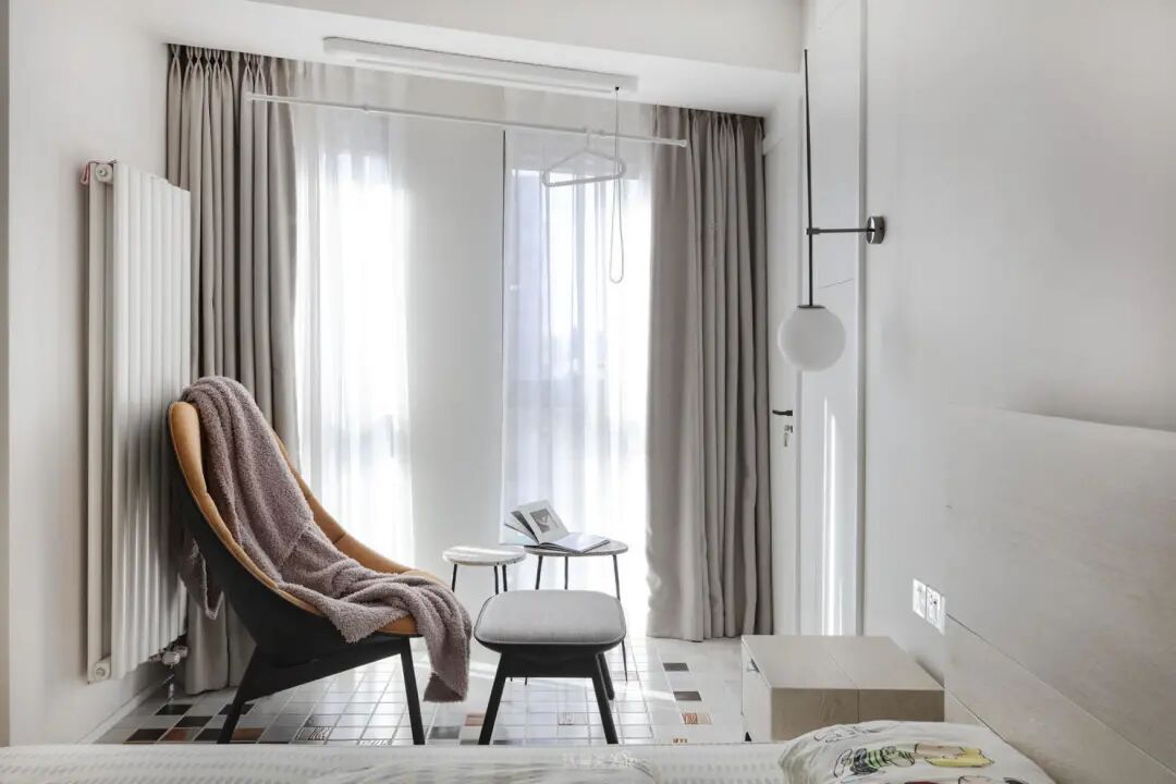 卧室靠窗位置将地面抬高形成独立的阳台休闲区。因为上方区域用来晾衣,抬高部分特地选用了瓷砖铺贴。