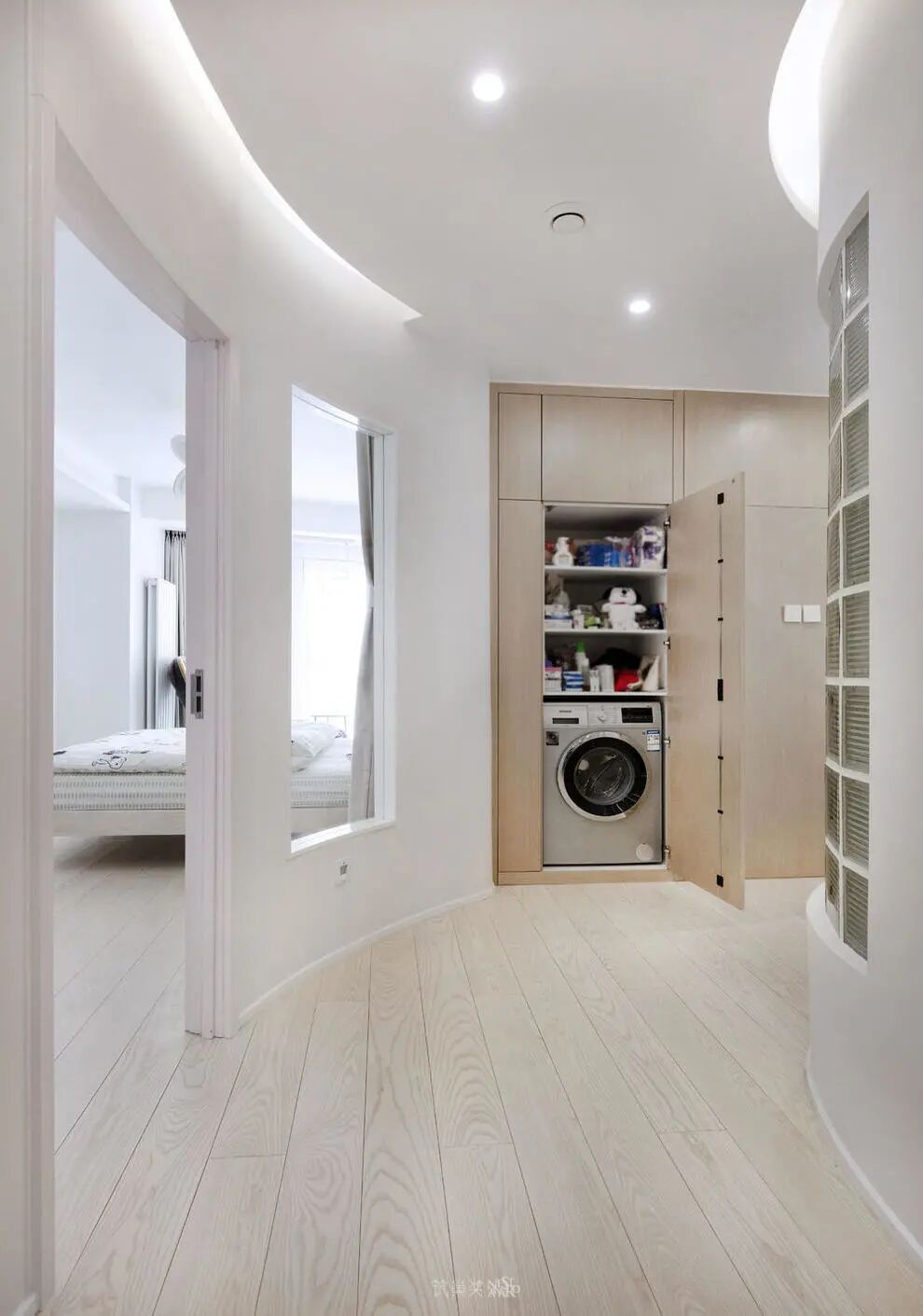过道处设立家务柜,嵌入洗衣机。虽然收纳柜的宽度不大,但增加的空间可以缓解不少收纳压力。隐藏式收纳处理,使空间看起来整洁,通透,没有过多繁复的装饰。