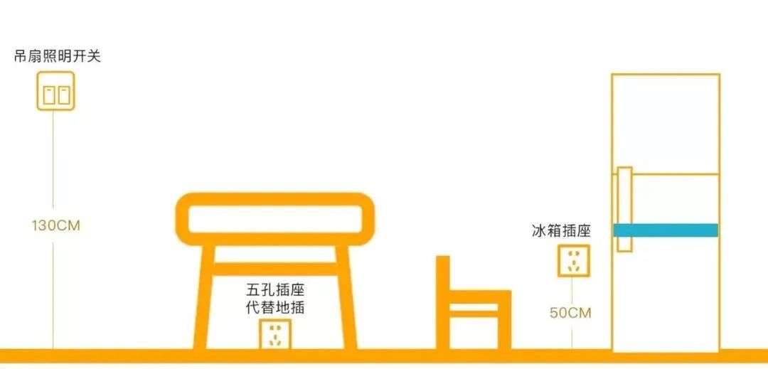 开关离地高度通常为1200~1300mm,家有老人或需坐轮椅的可适当降低。