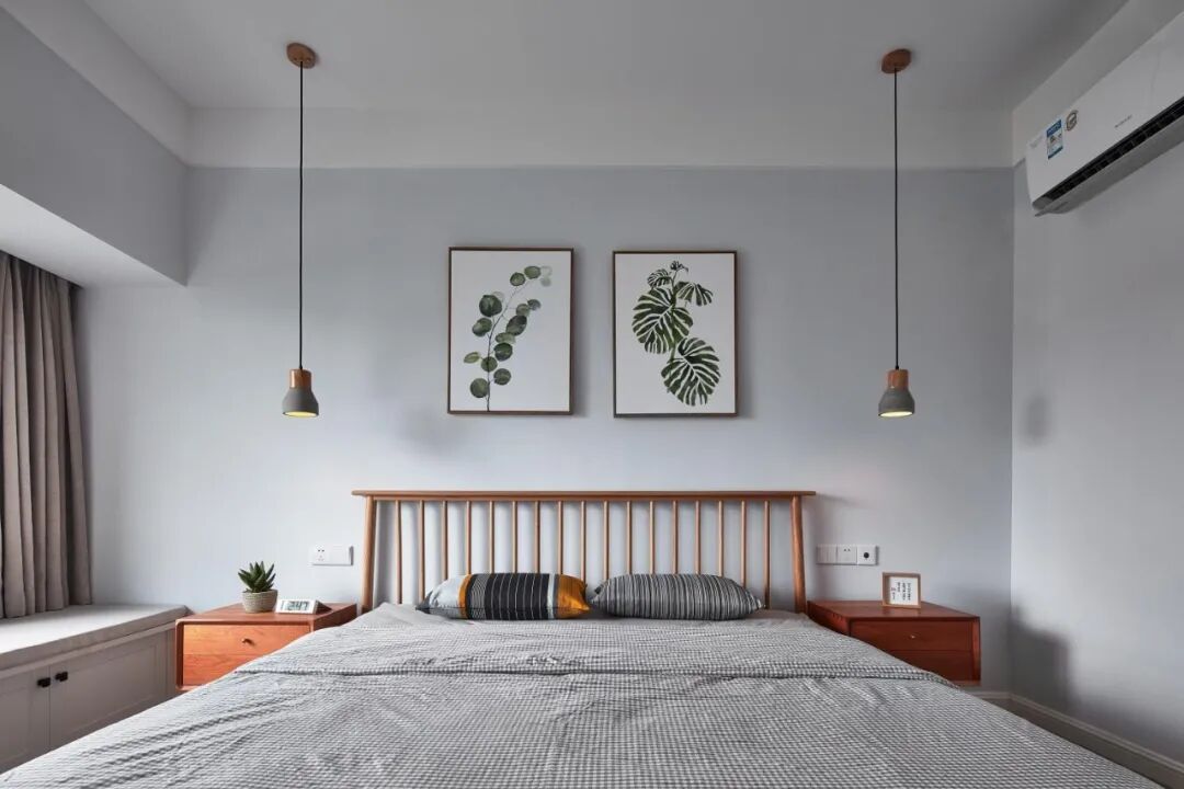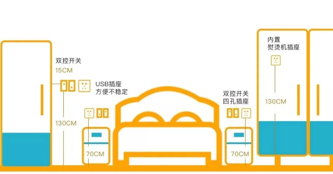 ③床头柜上方1-2个插座,方便用台灯和手机充电。要注意床的宽度,避免一侧插座被挡。床尾处1个插座,感应小夜灯方便起夜。