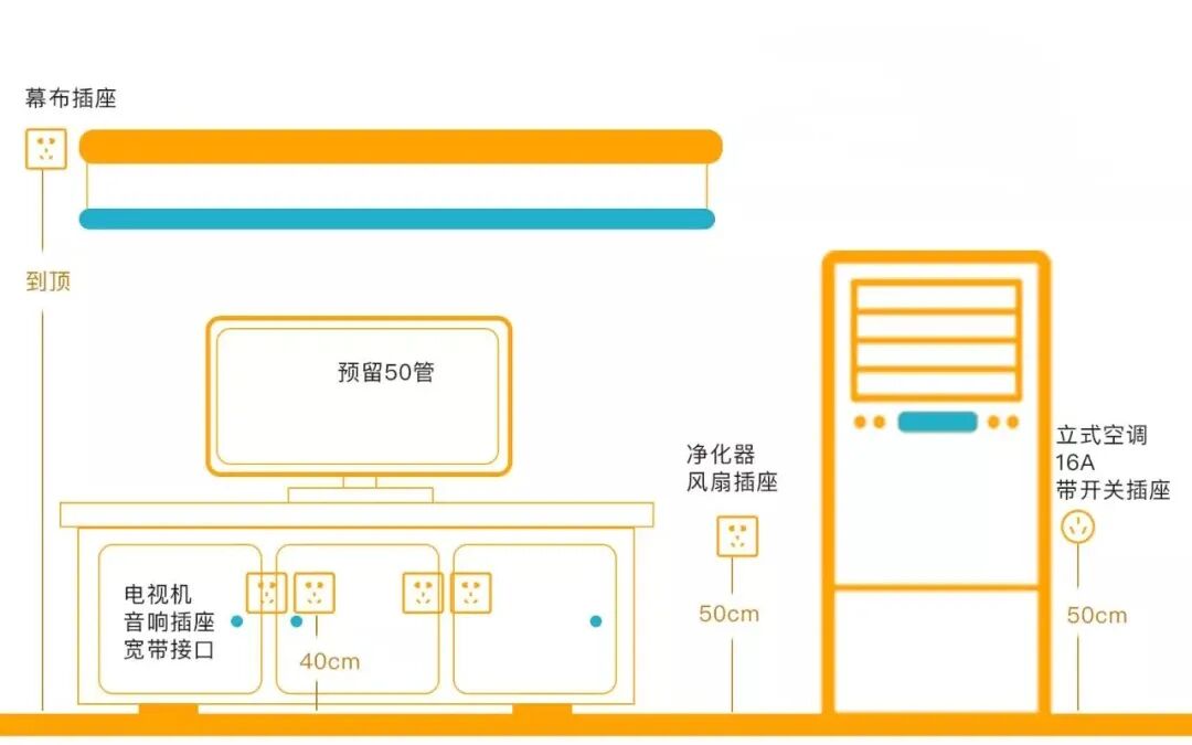 ②空调配1个16A空调专用插座,如有音响设备配1个插座,电扇、取暖器、空气净化器可以共用1个。