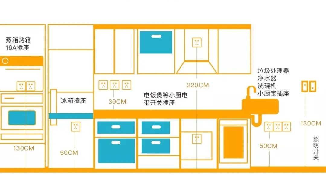 ③吸油烟机、蒸烤箱、洗碗机、集成灶、小厨宝插座各1个,尤其小厨宝、蒸烤箱等通常要配4平方电线,一般插线板用不了。如果定制嵌入式橱柜,需提前确定大电器的型号尺寸。