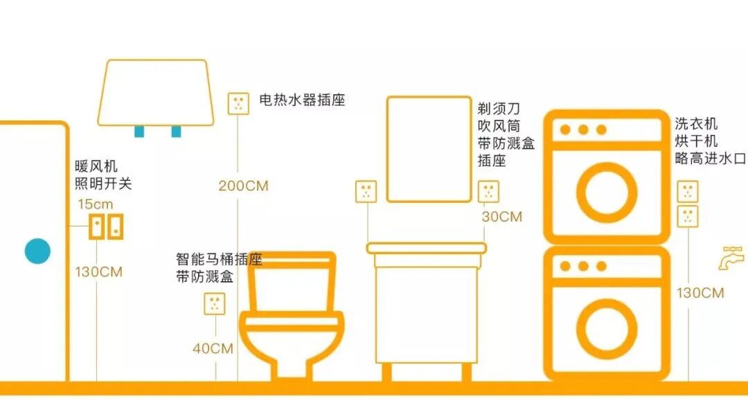 ②电热水器、洗衣机/烘干机、智能马桶(盖)、电热毛巾架各1个插座,即使暂时不装智能马桶还能给手机充电。