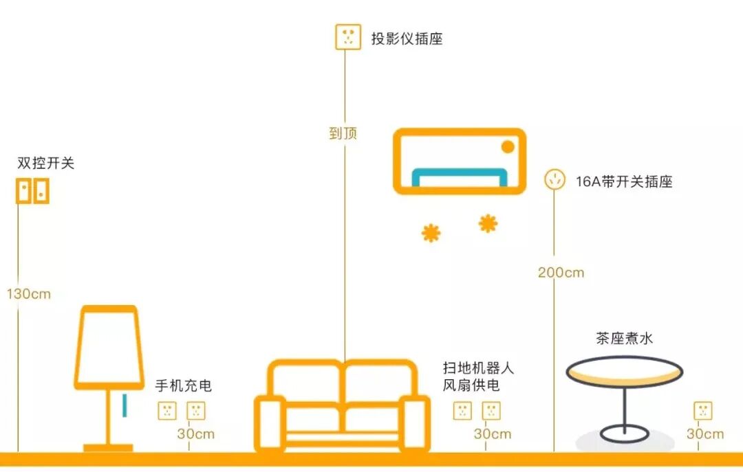 插座离地高度通常为300mm,大高个或家有老人的可适当提高,减少弯腰。