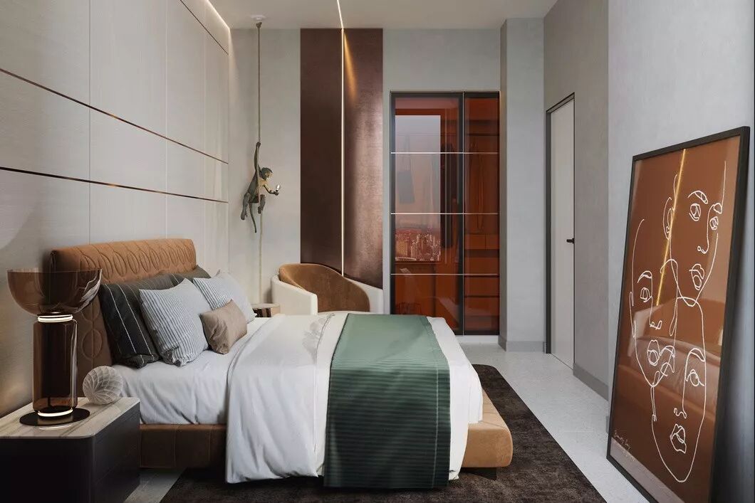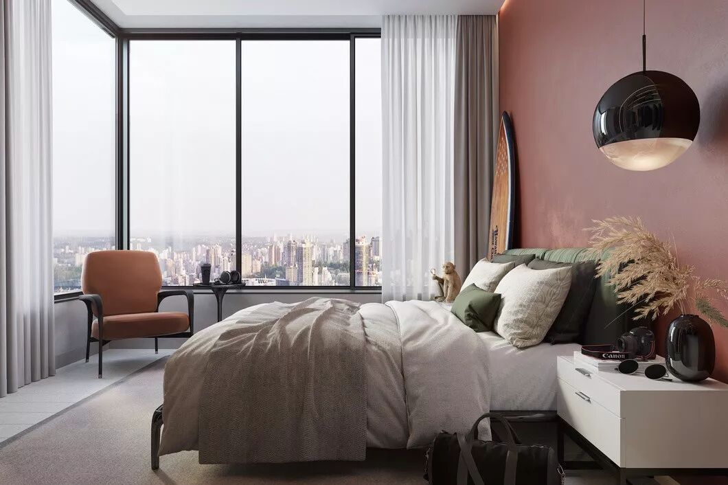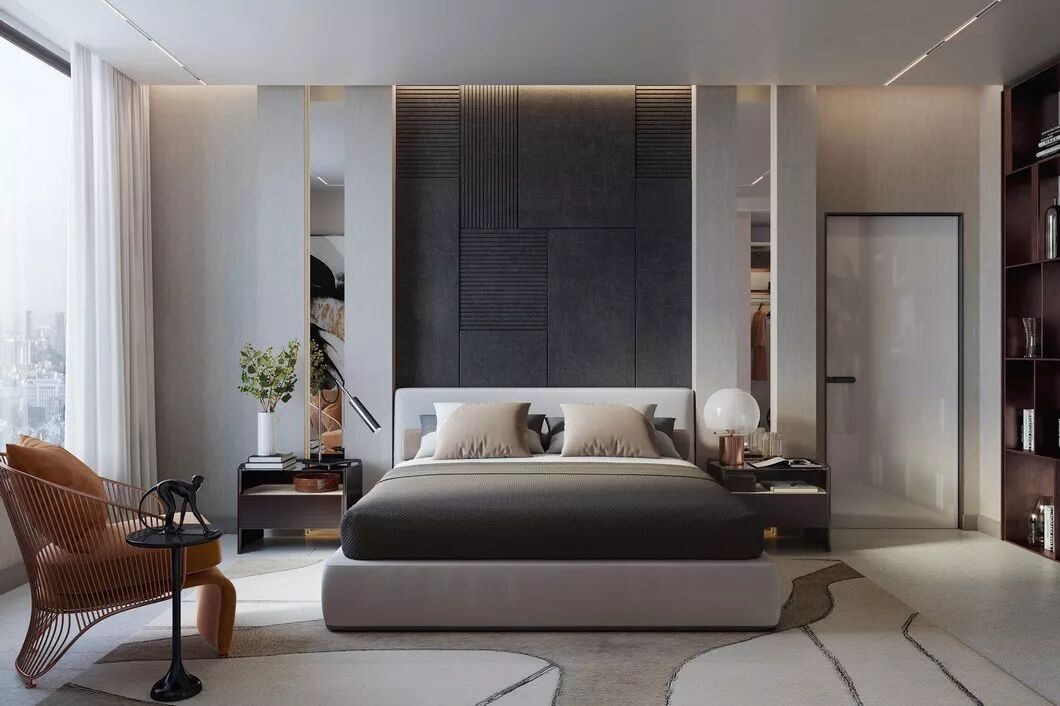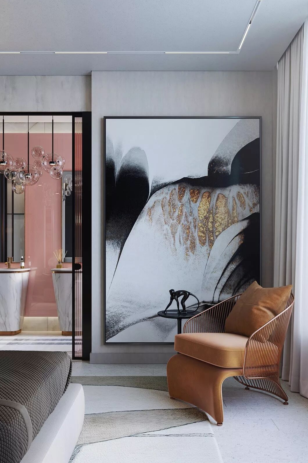 主卧套间采用开放式布局,同时容纳了睡眠区、衣帽间以及卫浴间,曼妙轻盈的艺术格调,线条流畅的家具,弧度柔和的椅子,与艺术家的画作都彰显出主人的独特品味。