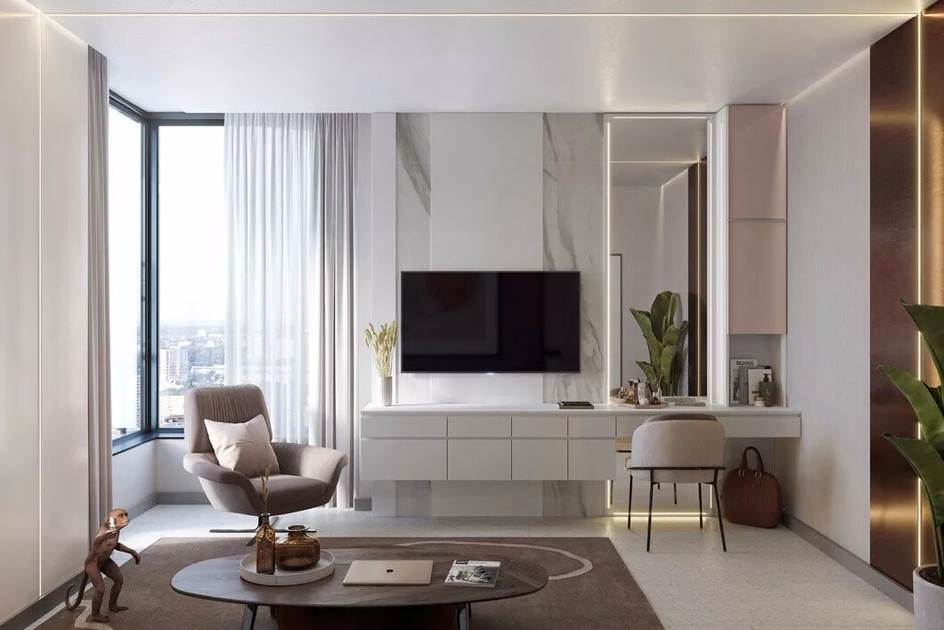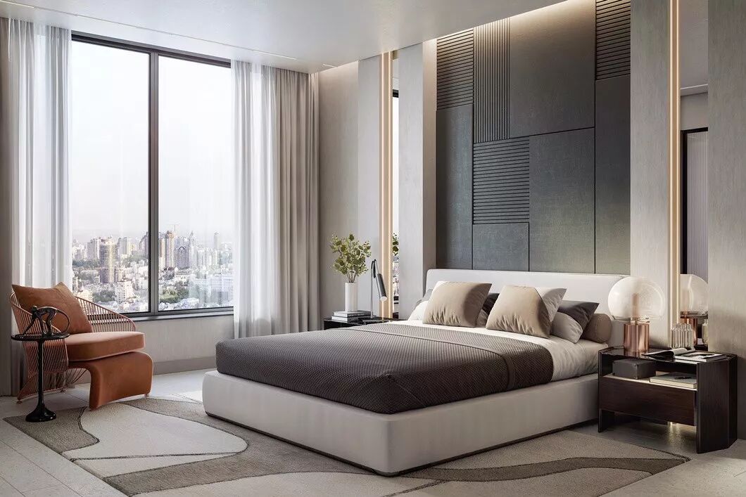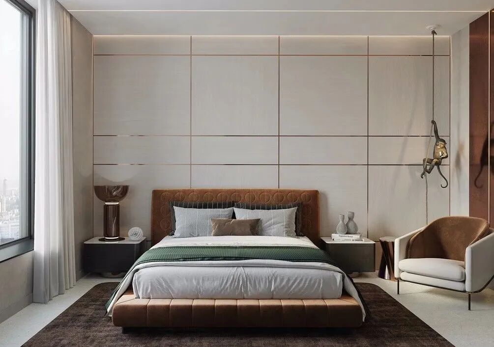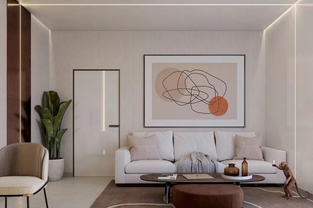 主卧套间采用开放式布局,同时容纳了睡眠区、衣帽间以及卫浴间,曼妙轻盈的艺术格调,线条流畅的家具,弧度柔和的椅子,与艺术家的画作都彰显出主人的独特品味。