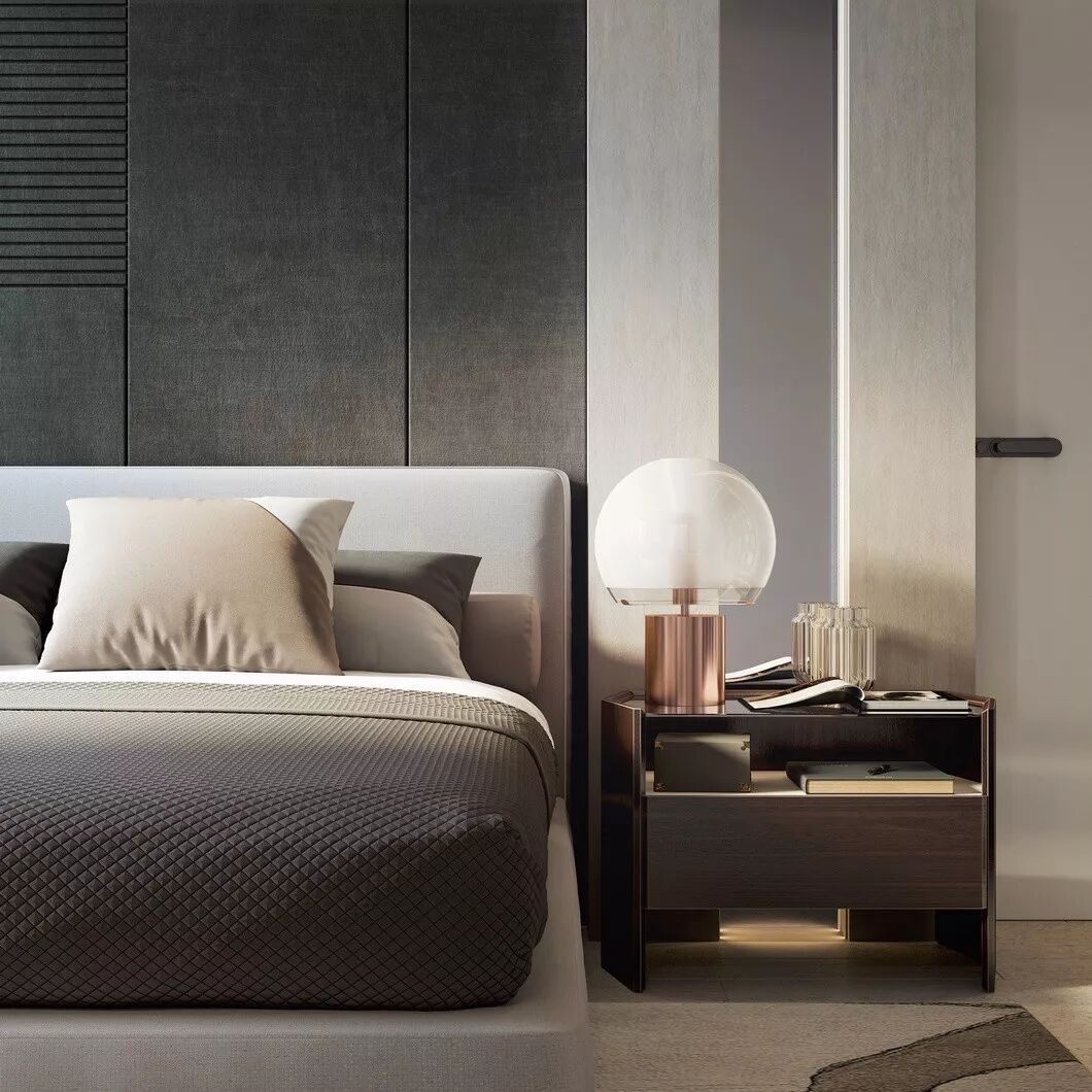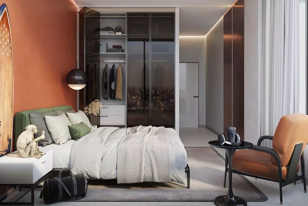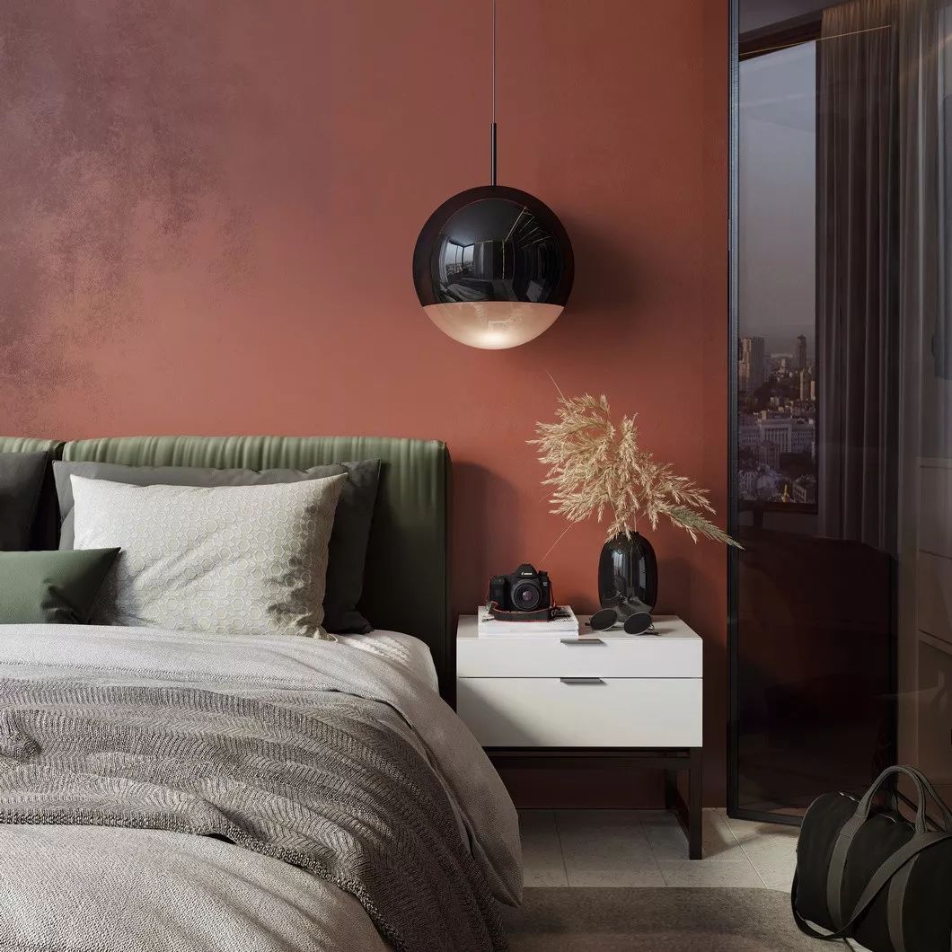 进入次卧,是一派国际风潮的私密空间,从墙面设计到家具造型,都是反复斟酌的精品之作。砖红色的背景墙搭配床头小吊灯,线条流畅优美。床头左侧隐藏式衣柜成为意外的惊喜,增加了超大的收纳空间。
