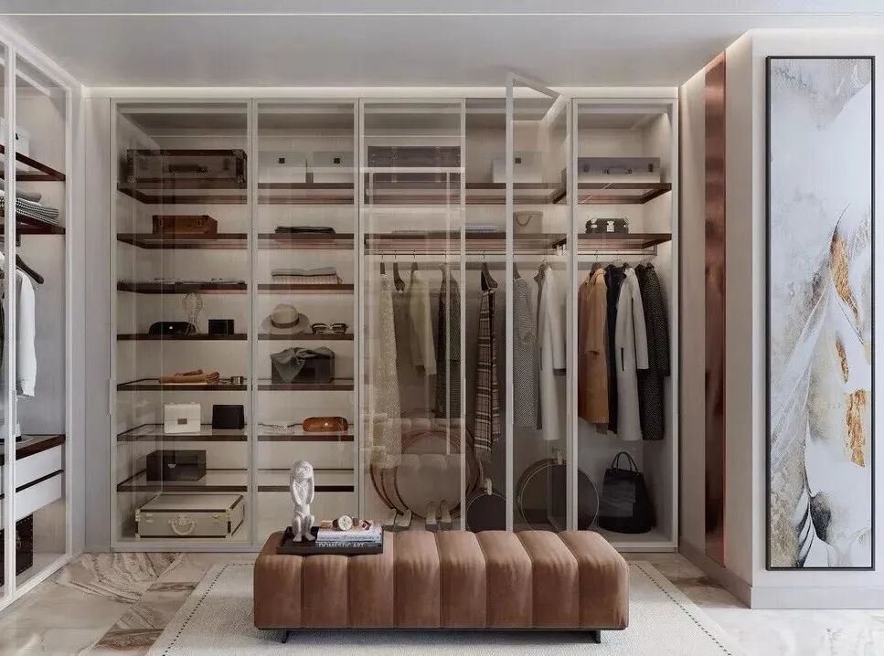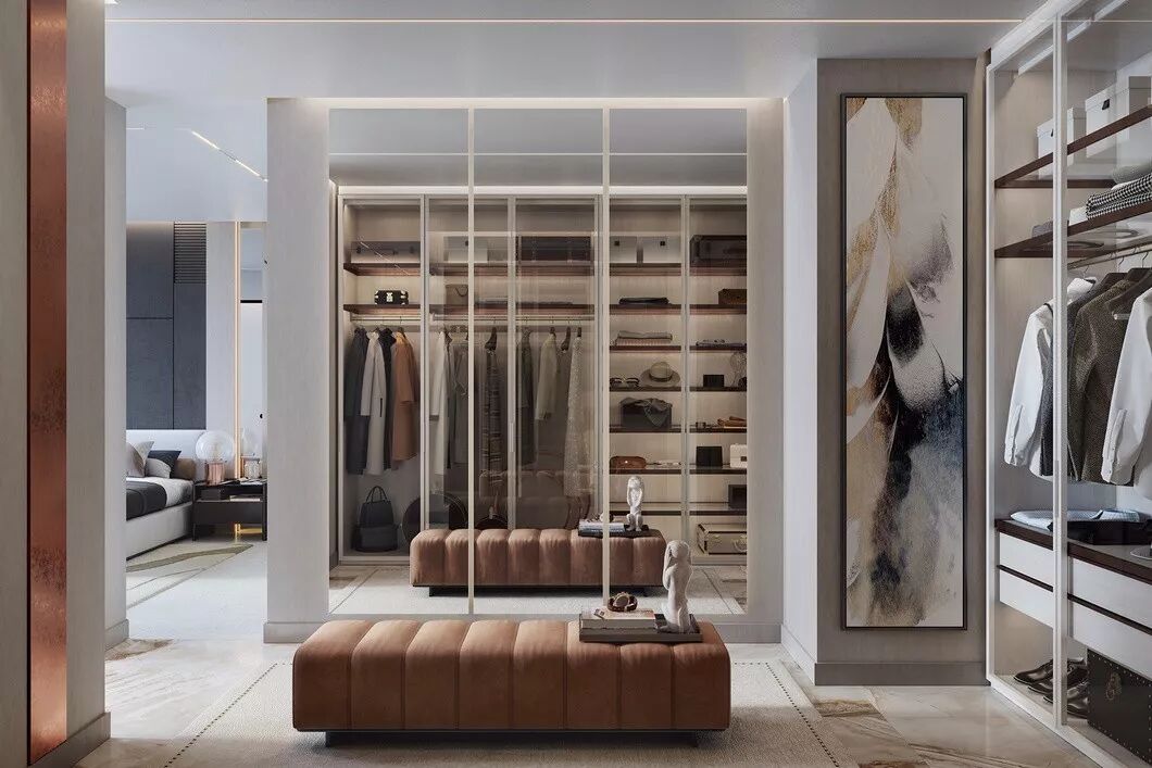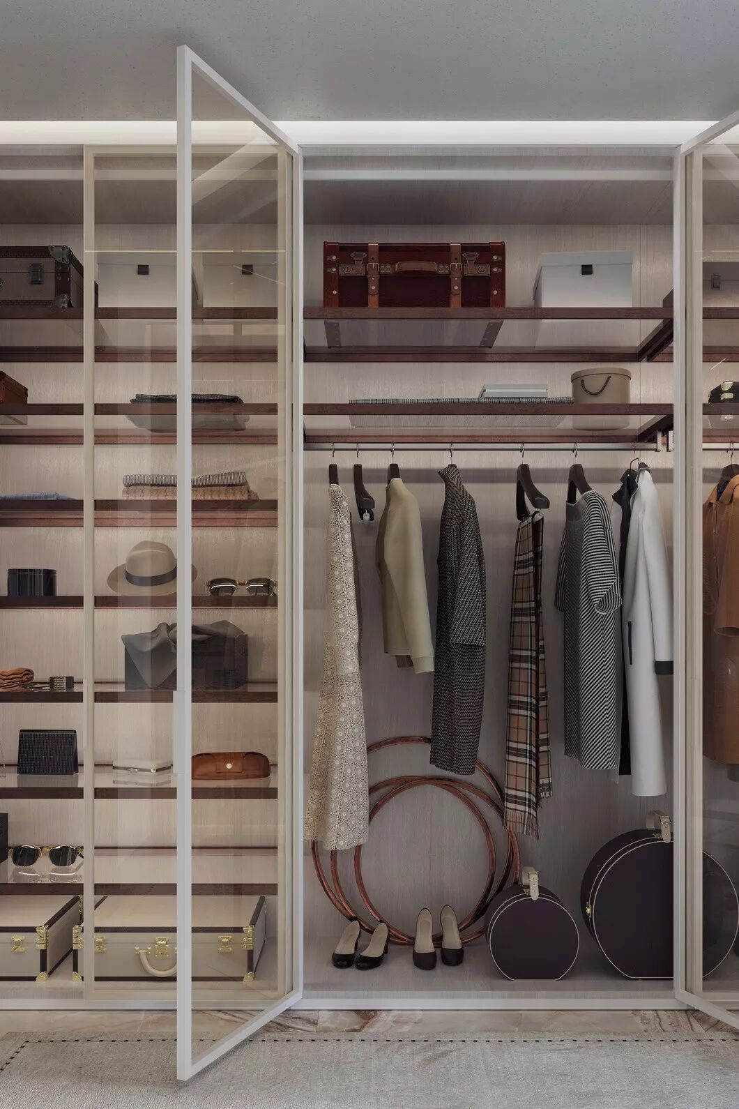 透明玻璃衣橱是时尚的首选,让收藏的衣服、包包、首饰都能在第一时间找到。空间划分上,设计师以大面积灰白色铺陈出衣帽间,辅以灯带勾勒轮廓。空间中仅剩木色墙板和透明柜门,让转角区域实用性和美观性兼具。
