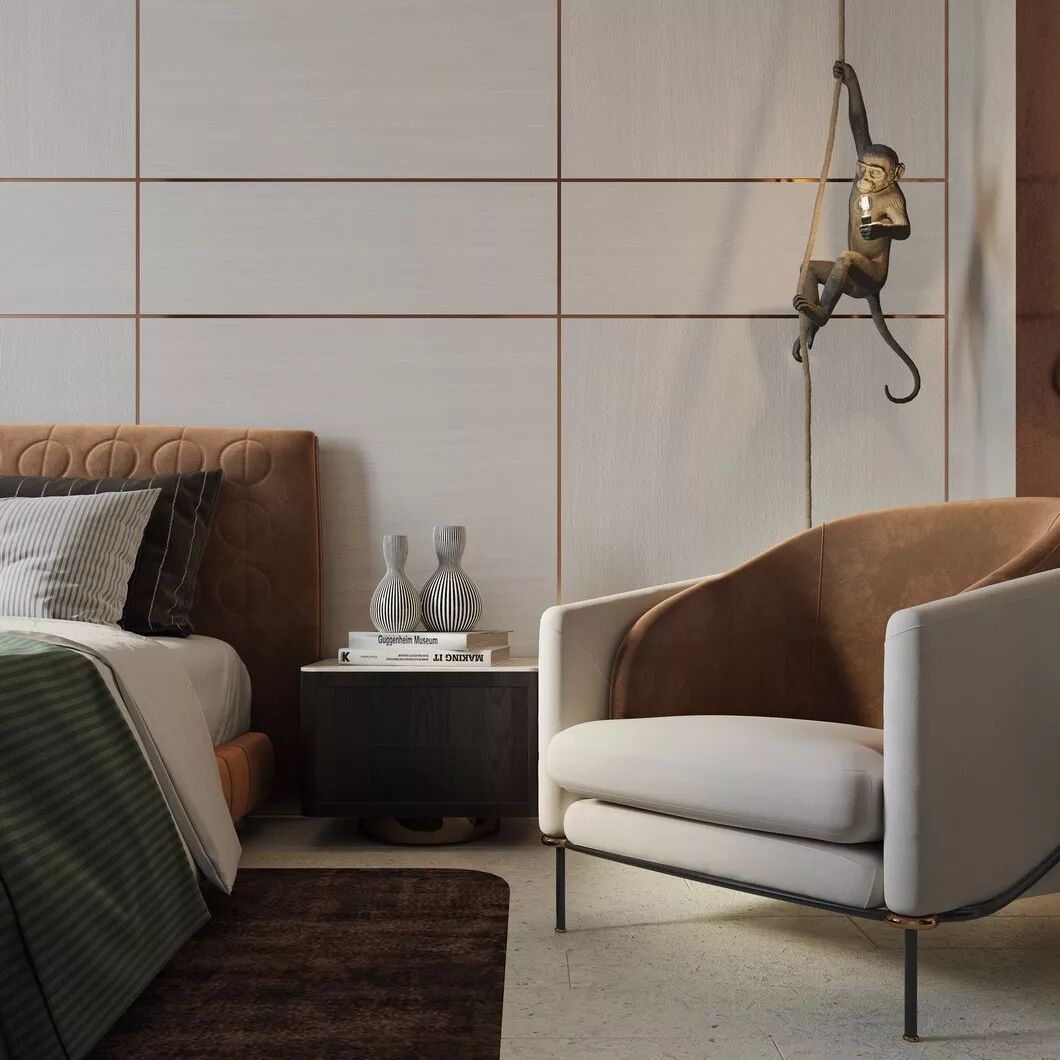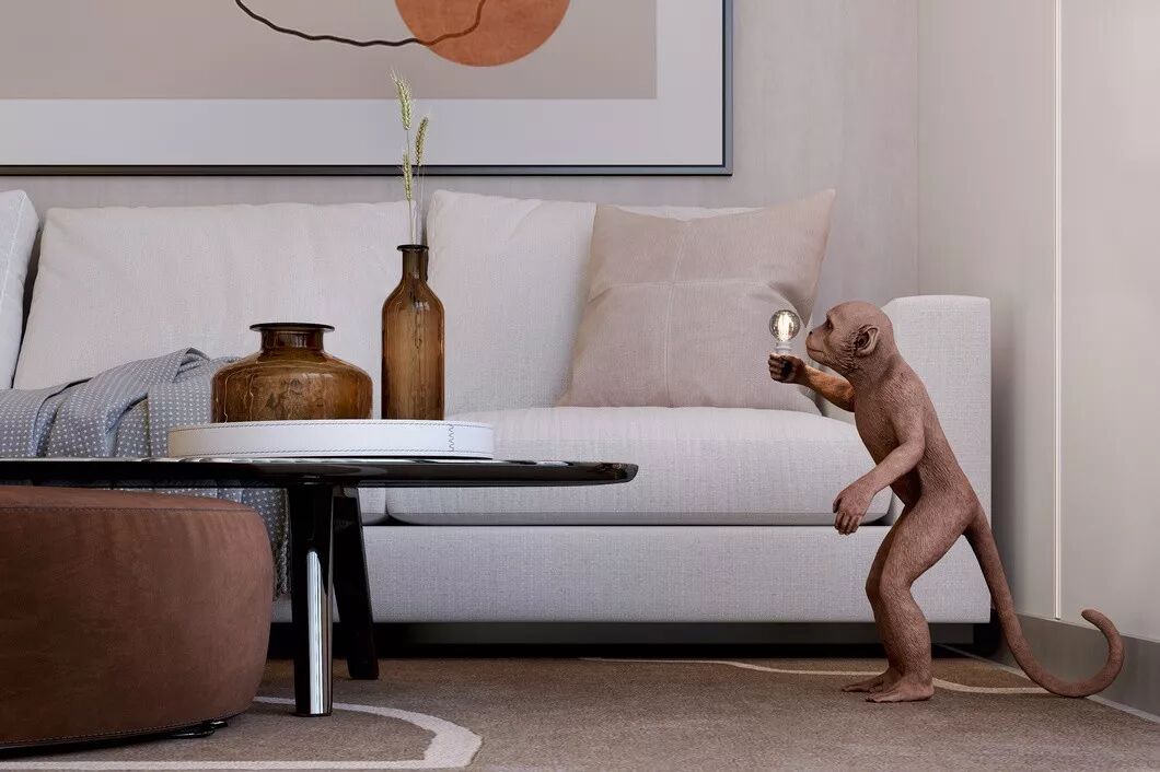 私人休闲区采用简洁轻盈的线条、轻快明亮的氛围,搭配趣味的猴子装饰品,以一个逸静悠远的艺术空间,唤醒心底纯粹的生活诉求。